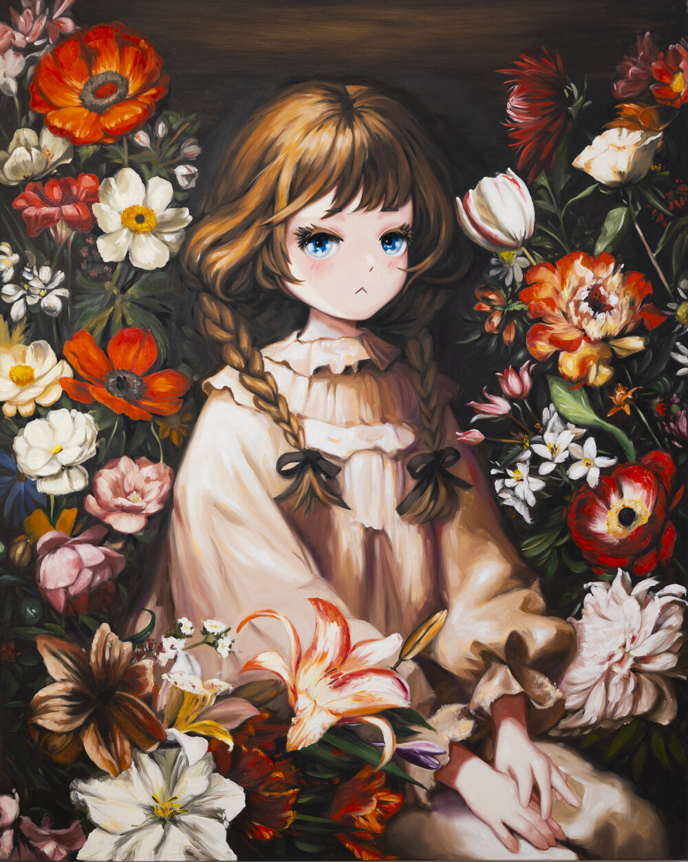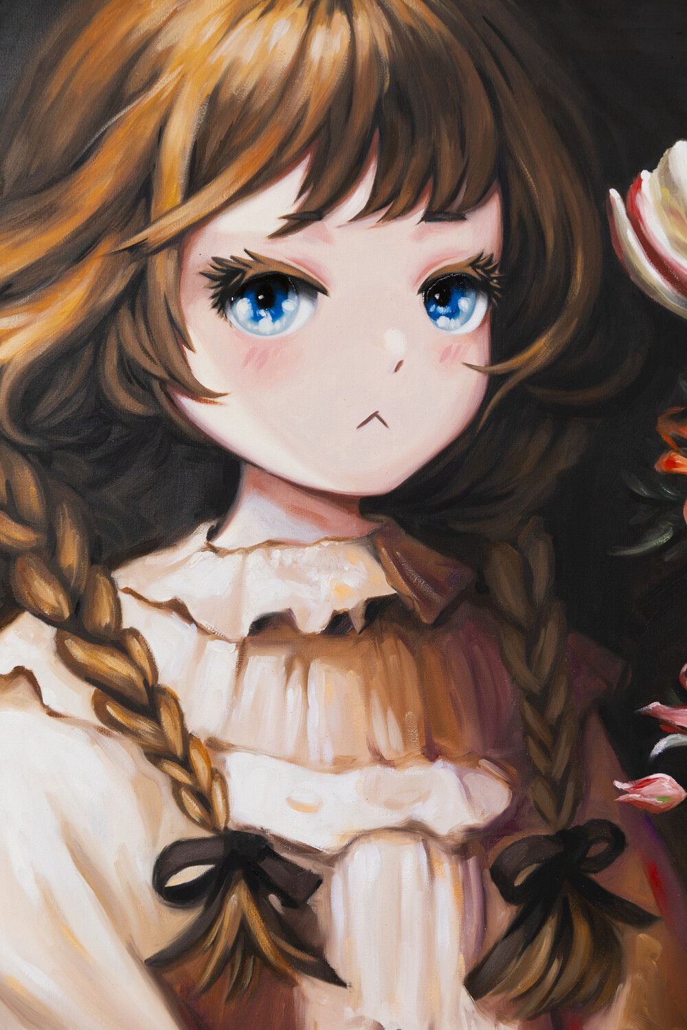 At the heart of Jade Kim’s work lies ”MIN,“ a character inspired by the childhood of the artist‘s wife, seamlessly interwoven with their shared conversations, dreams, and her favorite things. ”MIN“ is not simply a figure, but a vivid representation of the shared time, memories, and warmth between the artist and his wife. Set against a dreamlike and vibrant background, ”MIN“ symbolizes a peaceful and cozy refuge for the artist. The artwork’s vibrant hues and meticulous details eloquently express the profound love and respect it embodies.