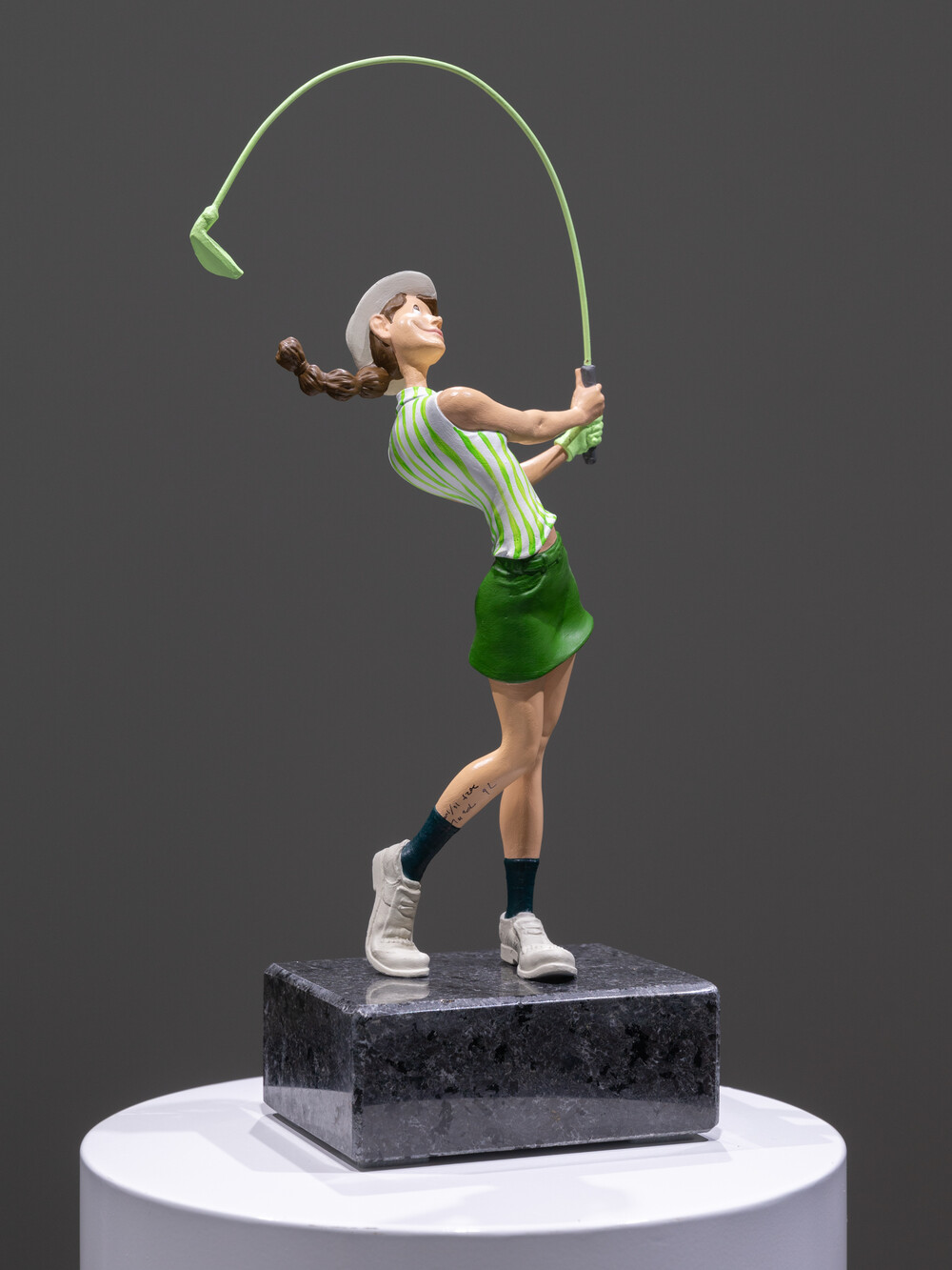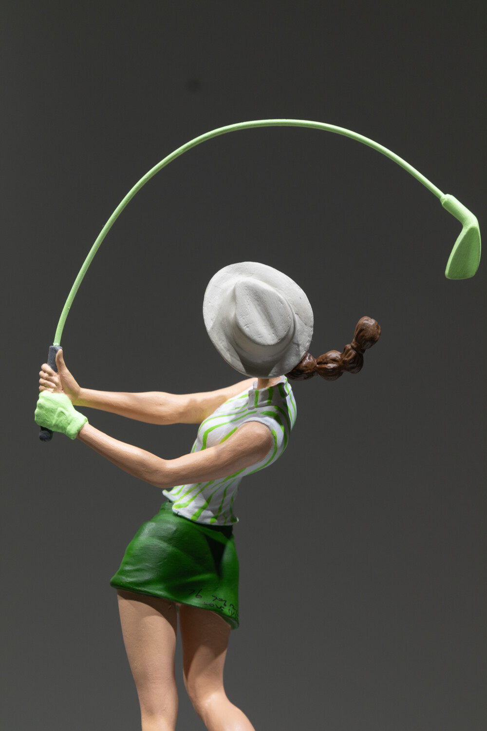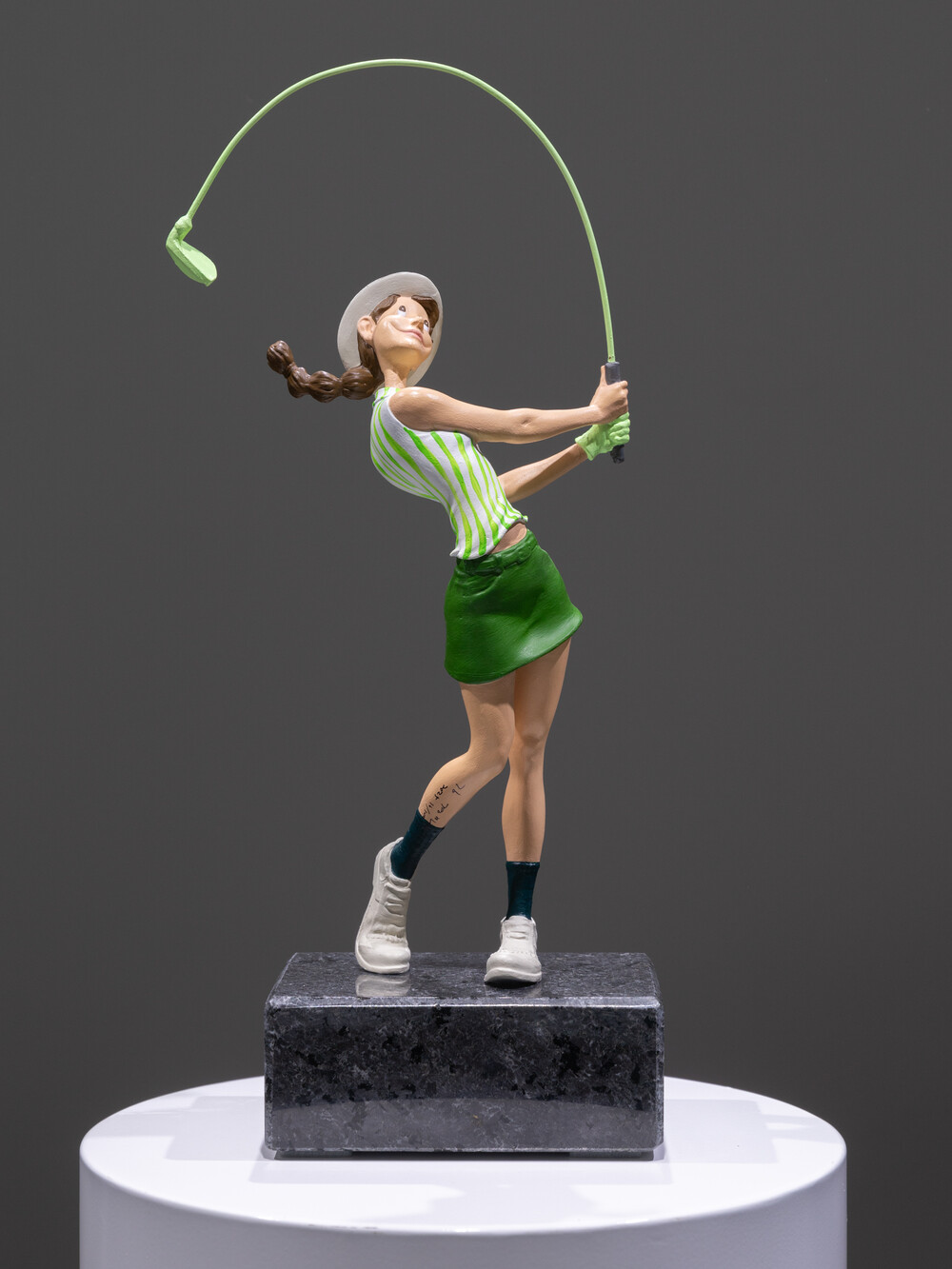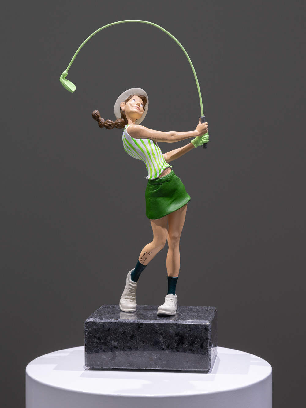 힘이 빠질 듯 말 듯한 자세, 자신감과 여유가 뒤섞인 표정, 동시에 멈춰 선 도도남, 도도녀의 균형감은 ‘나이스샷’을 확신하는 그 몇 초를 유쾌하게 형상화합니다.
