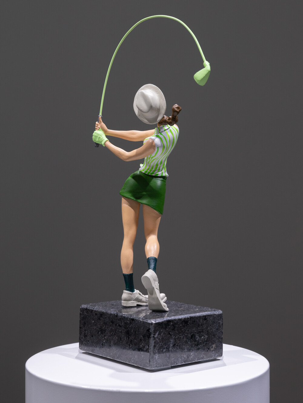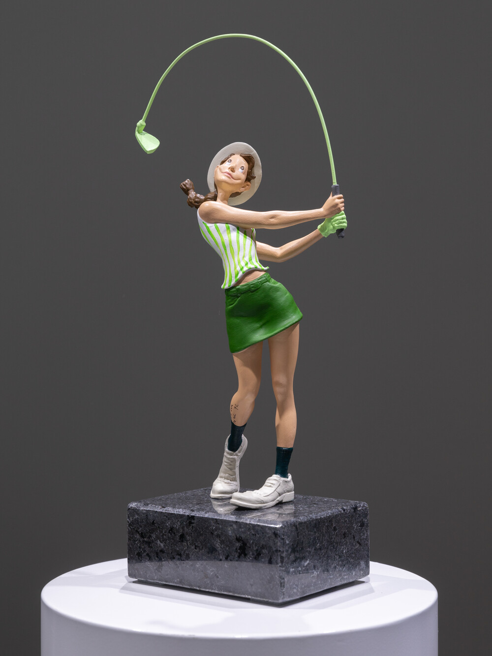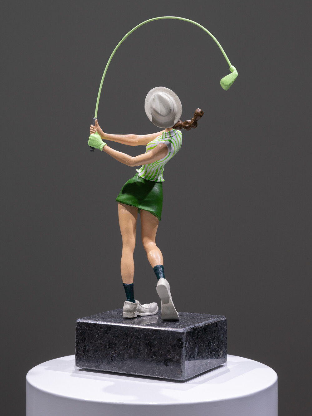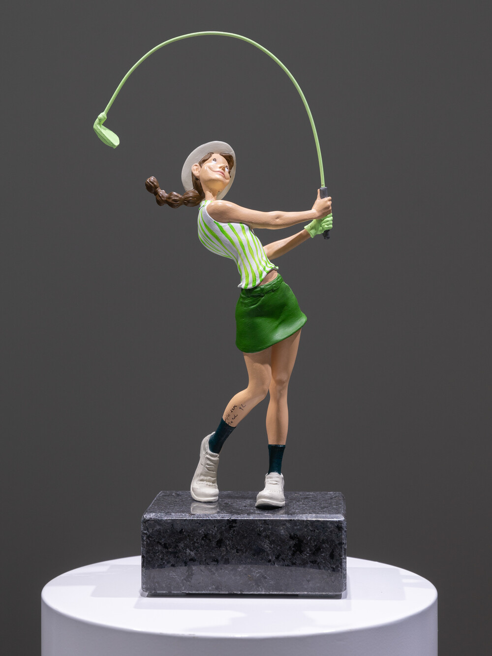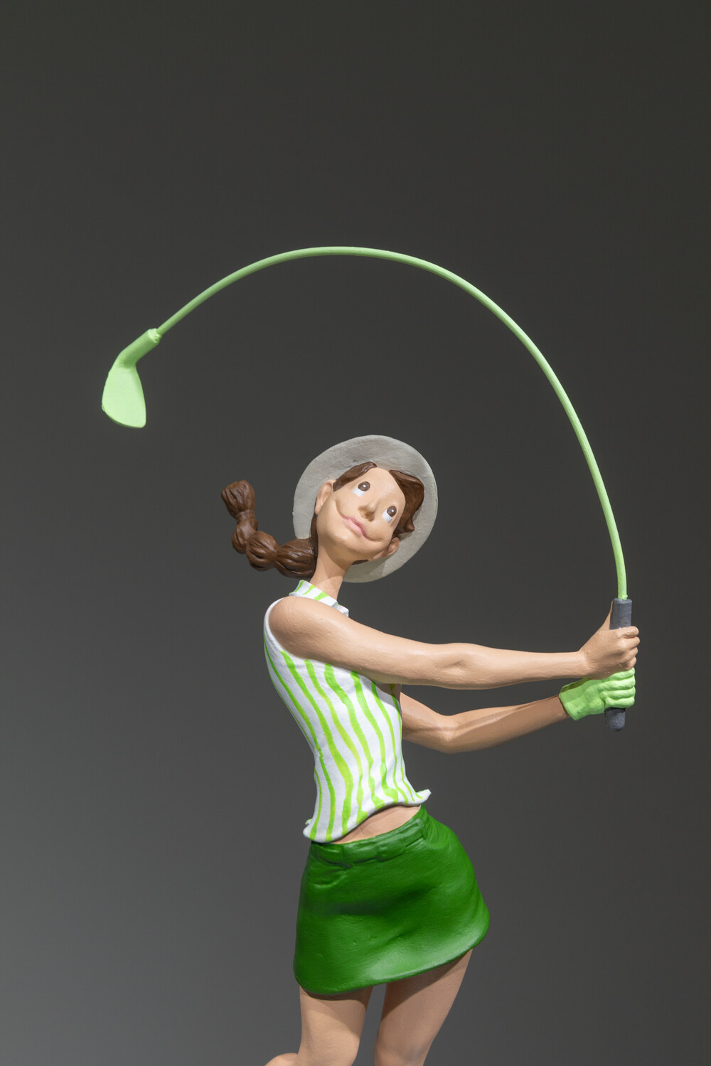 힘이 빠질 듯 말 듯한 자세, 자신감과 여유가 뒤섞인 표정, 동시에 멈춰 선 도도남, 도도녀의 균형감은 ‘나이스샷’을 확신하는 그 몇 초를 유쾌하게 형상화합니다.