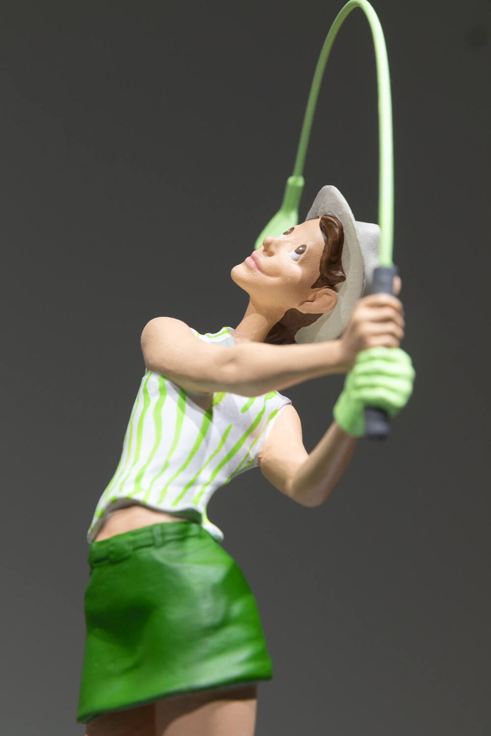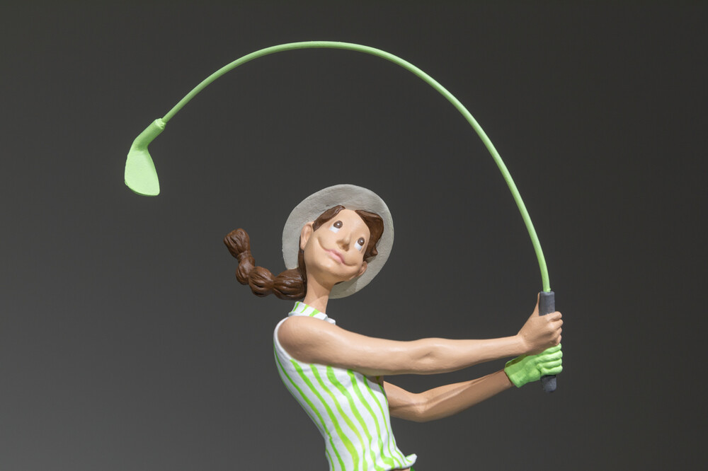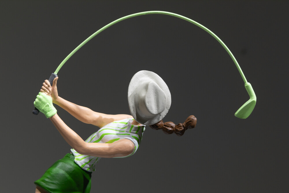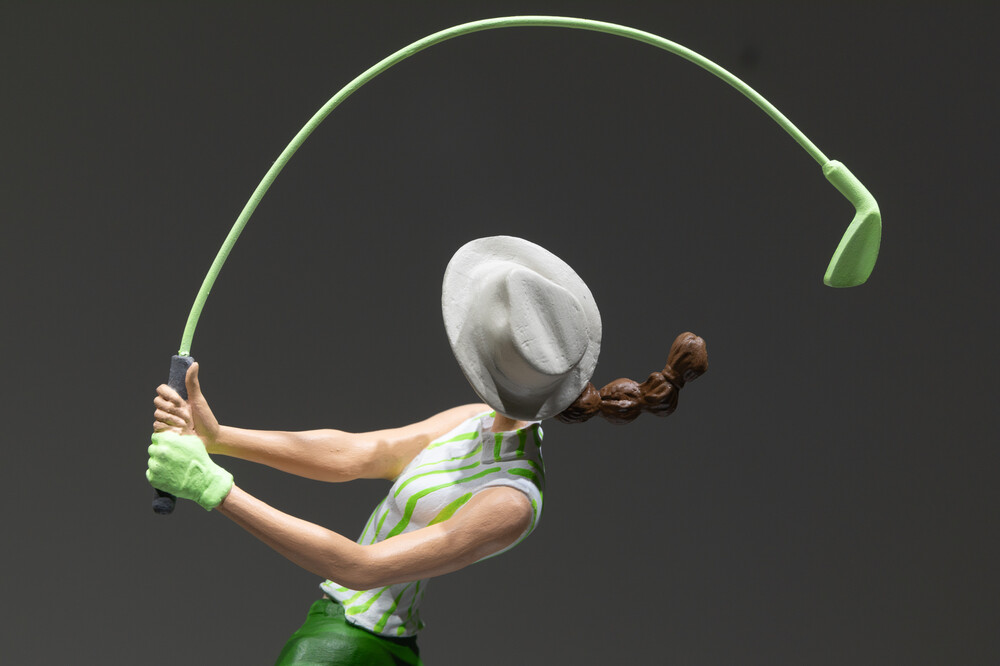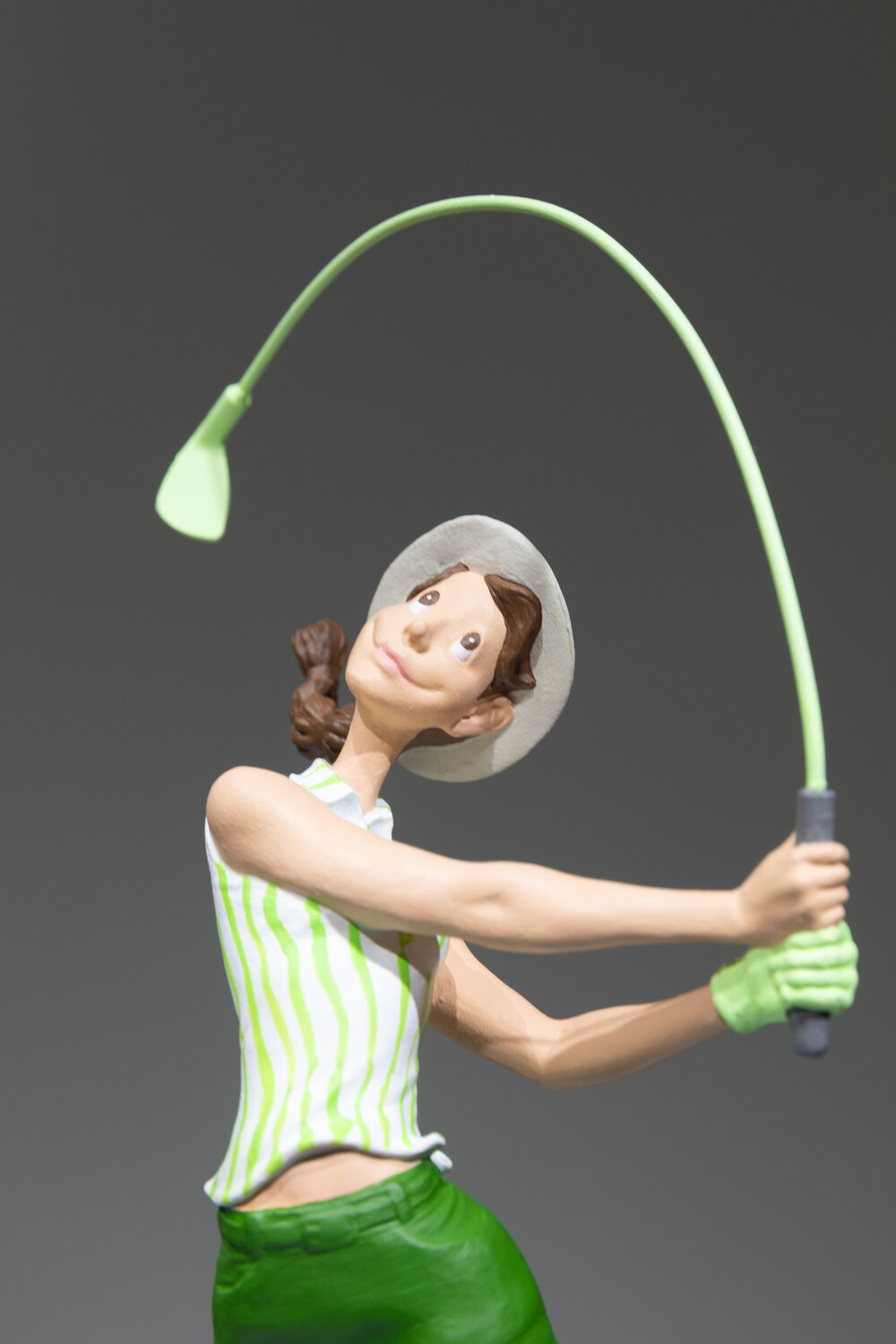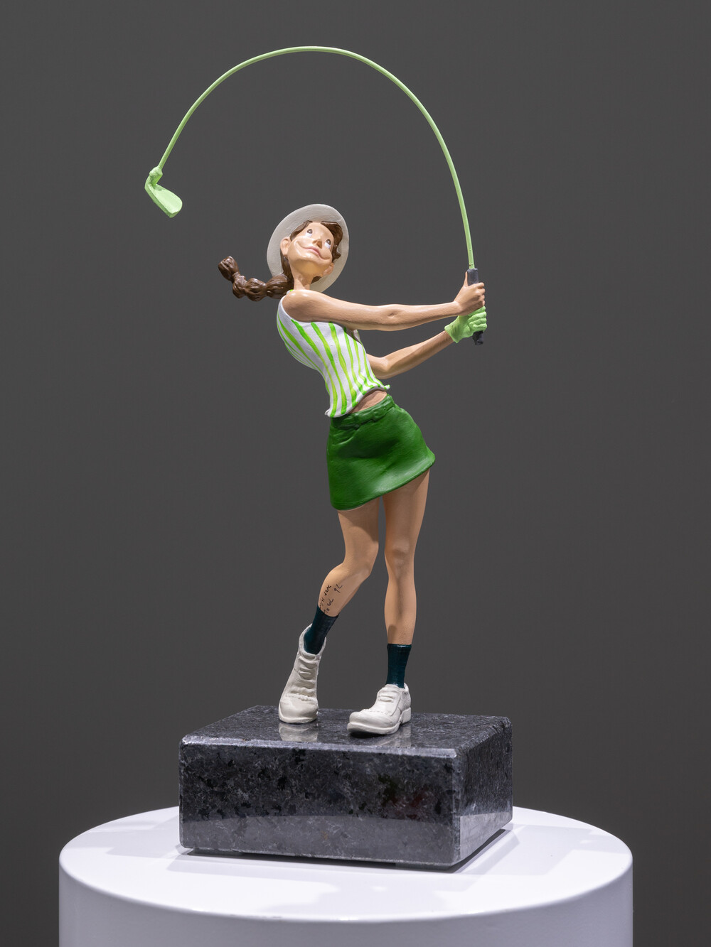 힘이 빠질 듯 말 듯한 자세, 자신감과 여유가 뒤섞인 표정, 동시에 멈춰 선 도도남, 도도녀의 균형감은 ‘나이스샷’을 확신하는 그 몇 초를 유쾌하게 형상화합니다.
