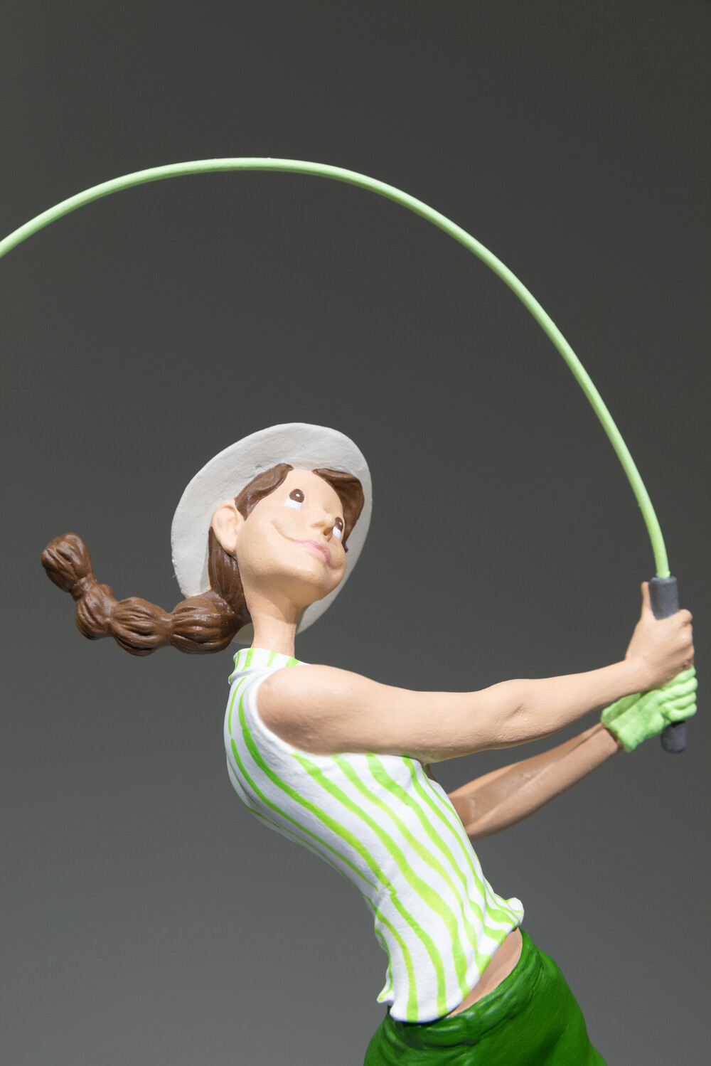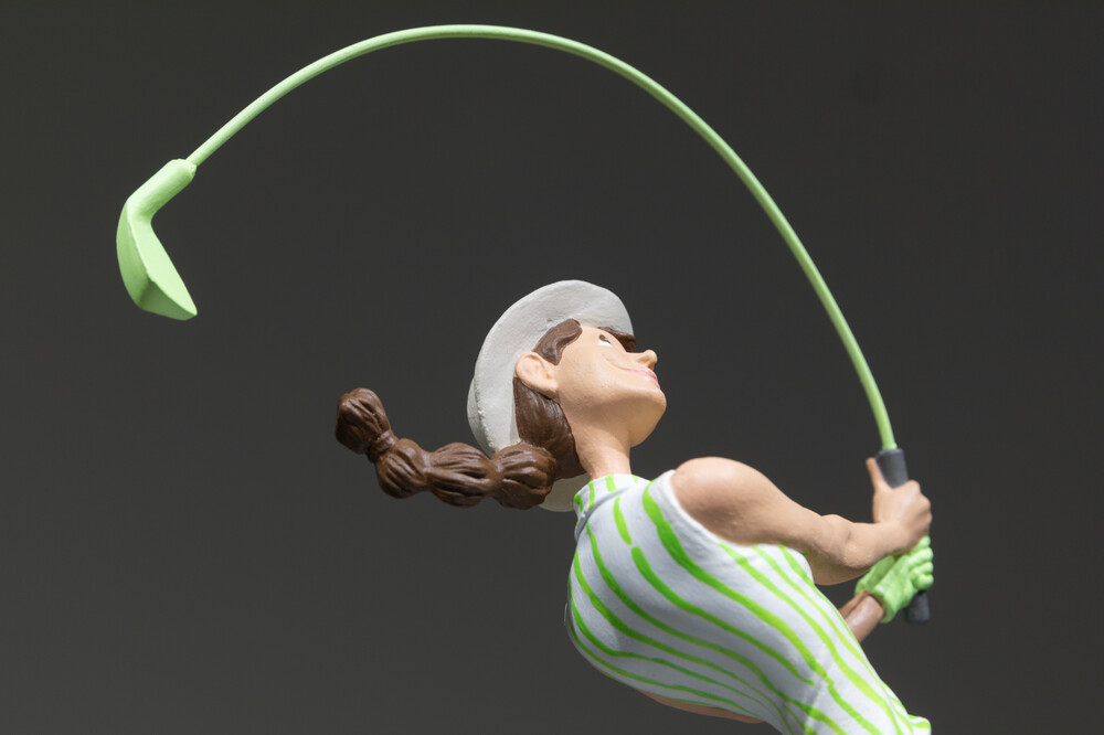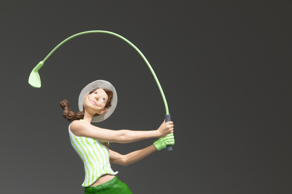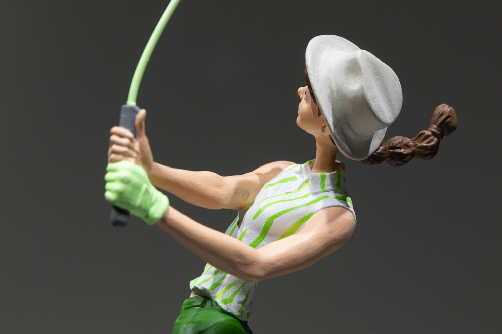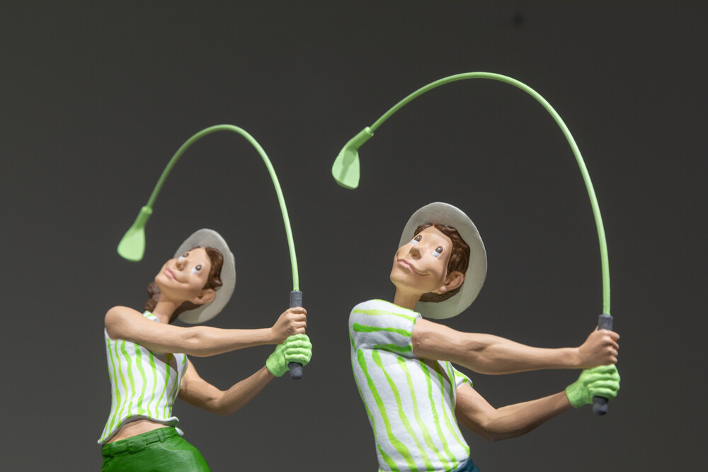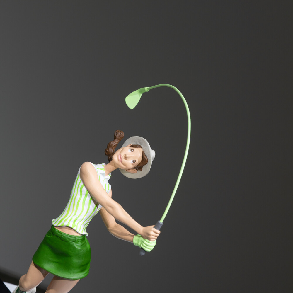 힘이 빠질 듯 말 듯한 자세, 자신감과 여유가 뒤섞인 표정, 동시에 멈춰 선 도도남, 도도녀의 균형감은 ‘나이스샷’을 확신하는 그 몇 초를 유쾌하게 형상화합니다.