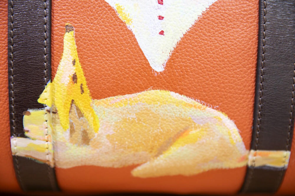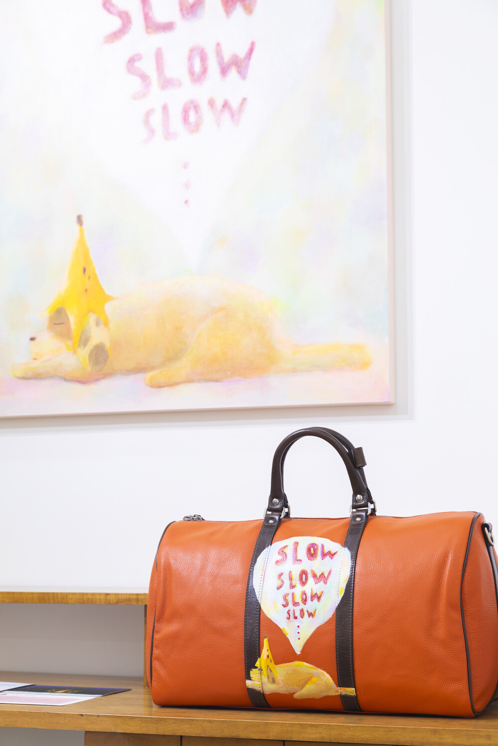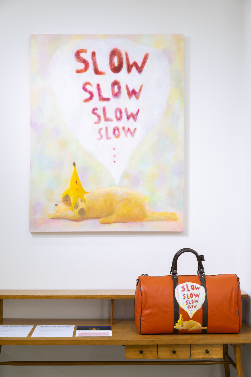 바나나껍질을 뒤집어쓴 강아지가 누워 있습니다. 눈은 감겨 있고, 조용한 공기 속에 그대로 녹아든 듯한 모습입니다. 그 위로는 커다란 말풍선이 떠 있고, 그 안엔 “SLOW”라는 단어가 점점 작아지며 반복되고 있습니다. 마치 잠든 사이에도 속삭이듯 이어지는 주문처럼 느껴집니다.