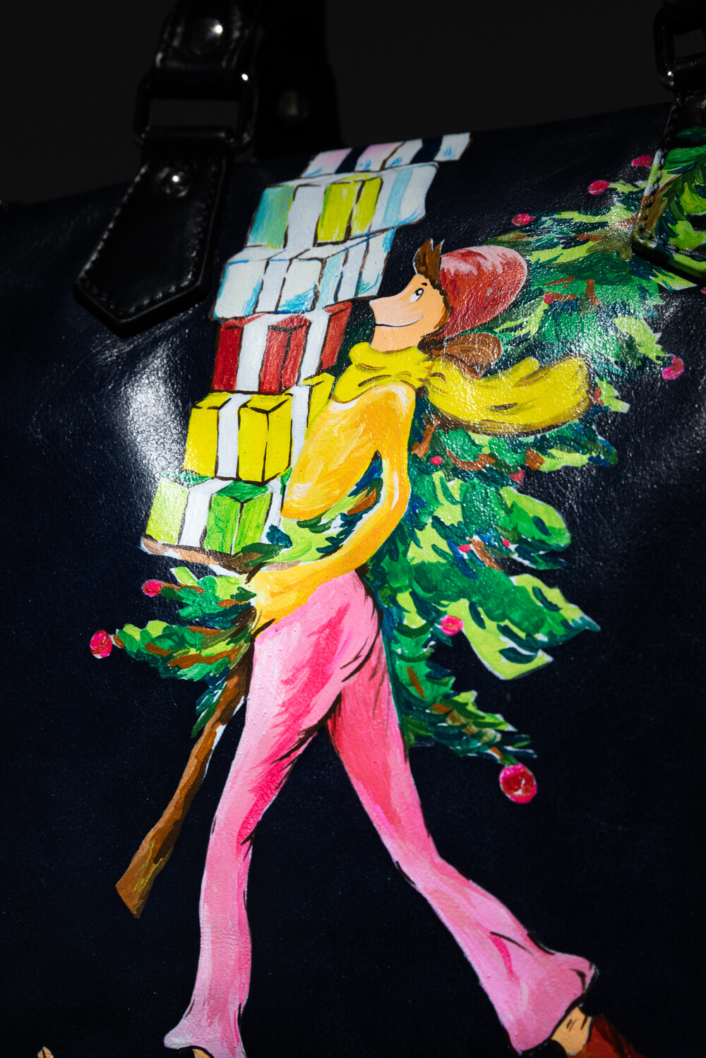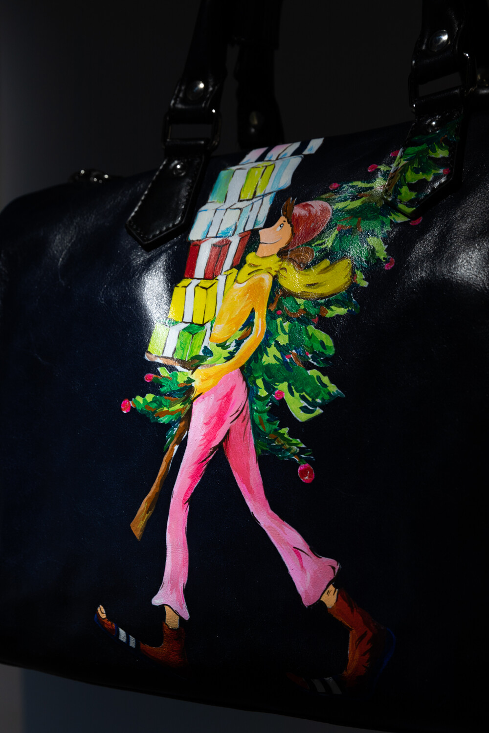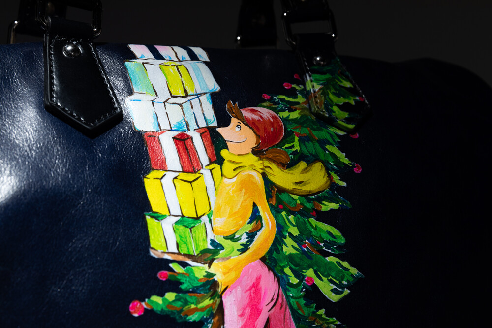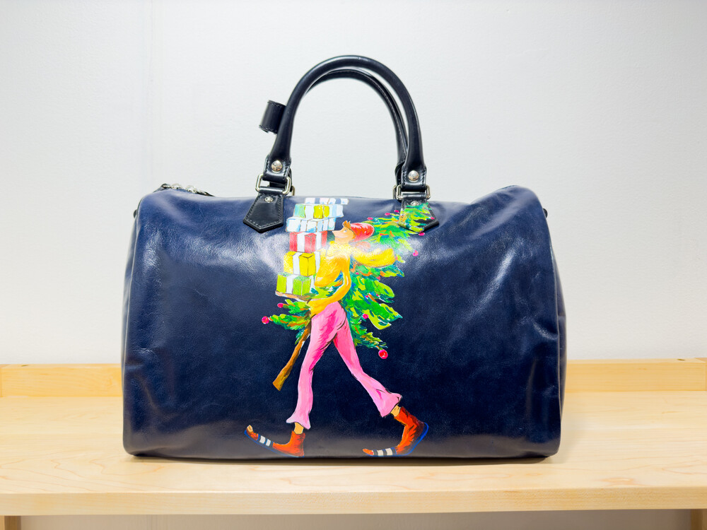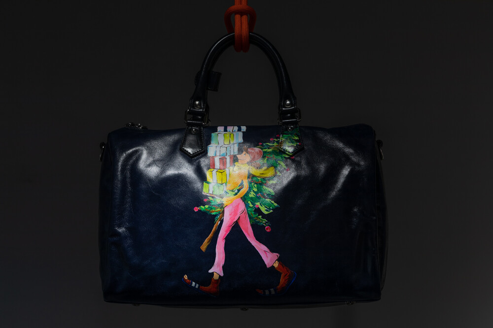 크리스마스 트리와 함께 허리를 감싸 안고 기쁜 마음으로 선물을 전하러 가는 여성의 모습과 연말과 크리스마스 특유의 풍성하고 따뜻한 분위기를 표현한 < Merry Christmas >의 작품이 그려진 보스턴백입니다.