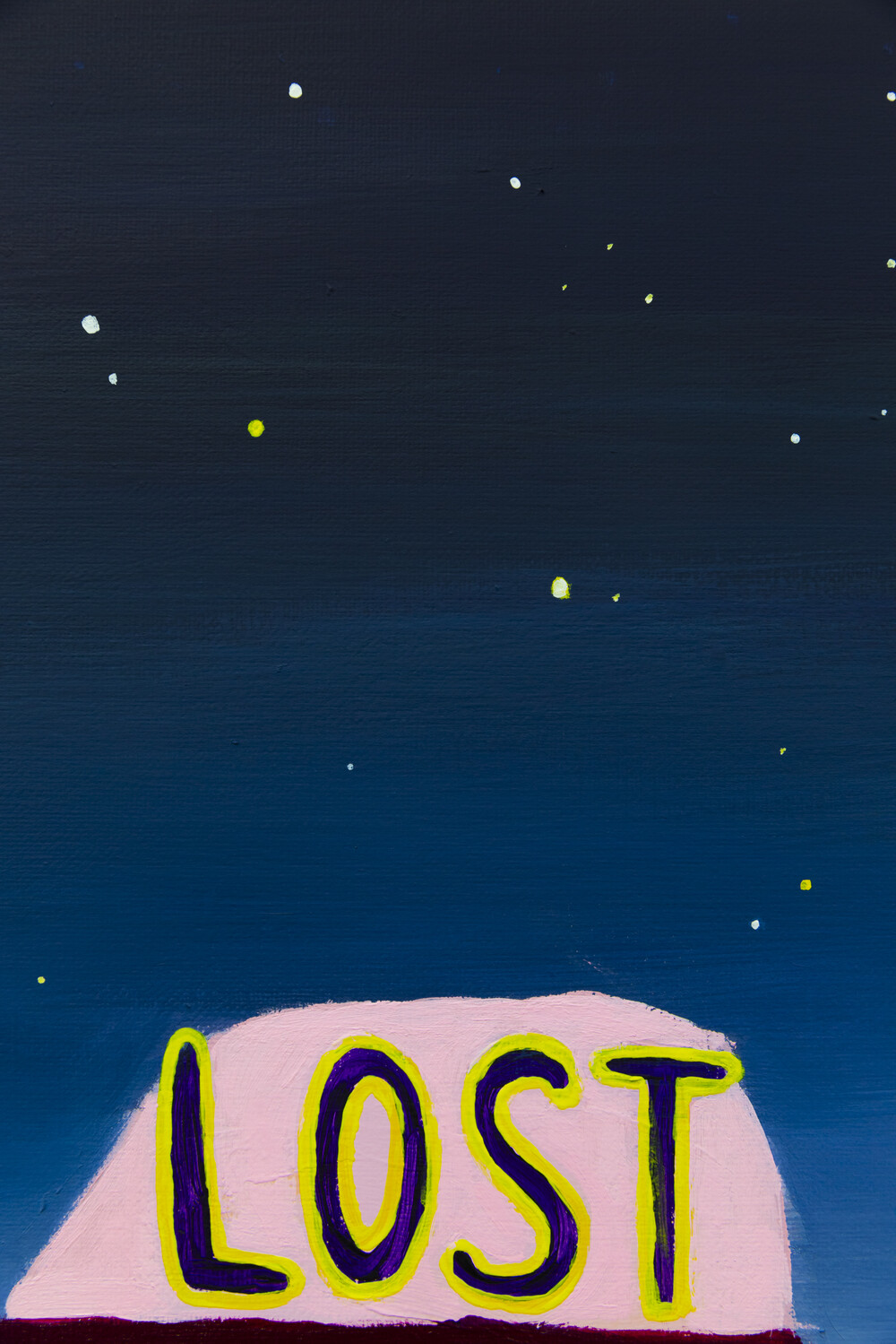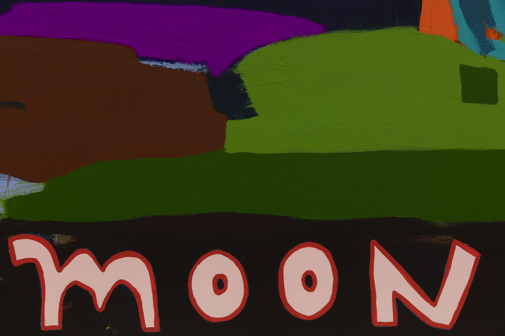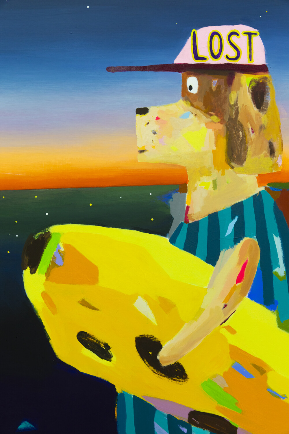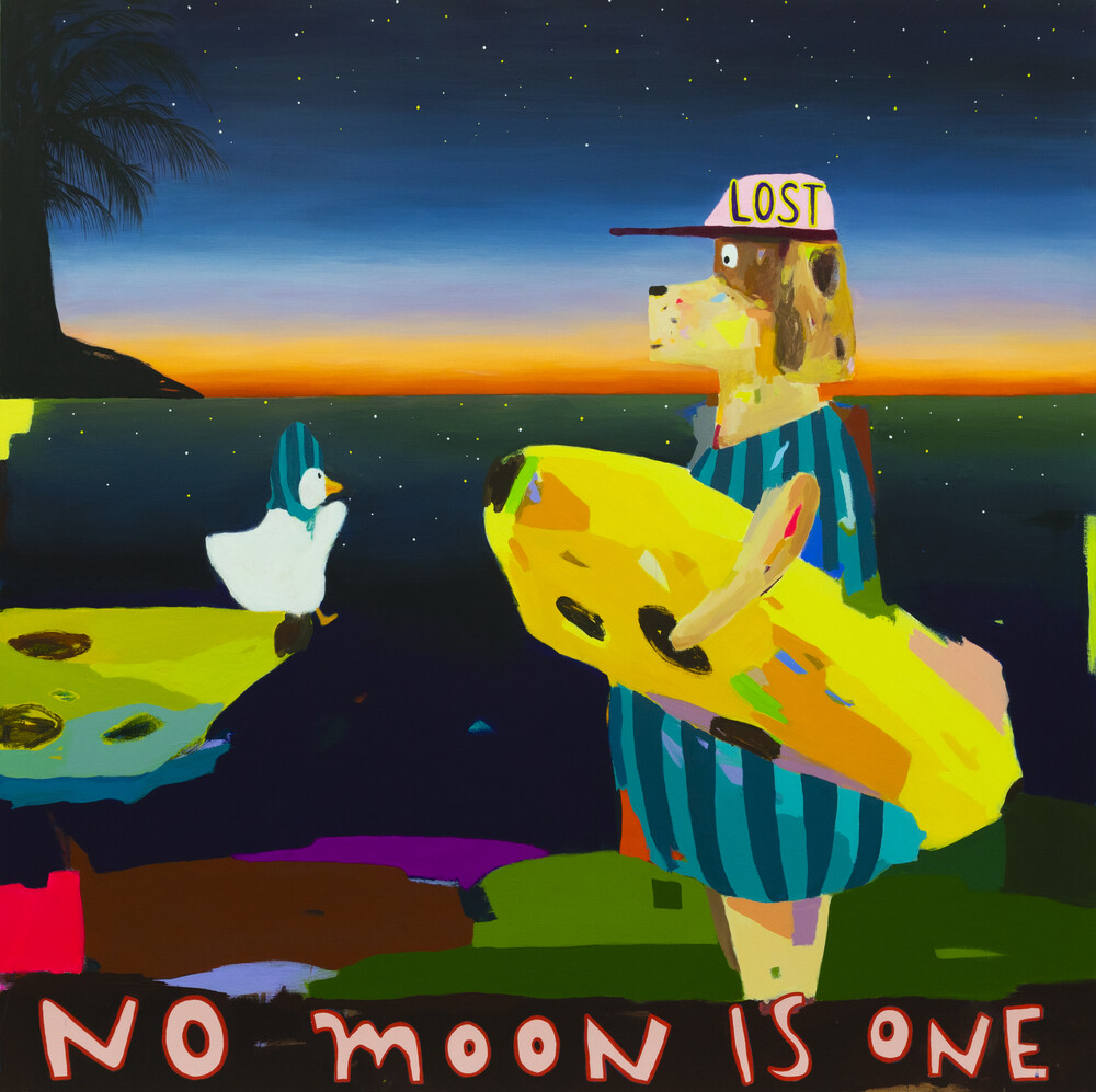 이 작품은 낯설면서도 따뜻한 분위기를 지니고 있습니다. 화면 중심에는 줄무늬 옷을 입은 강아지가 노란색 바나나를 안고 서 있으며, 모자에는 “LOST”라는 단어가 적혀 있습니다. 강아지 앞에는 오리가 말을 건네는 듯한 자세로 서 있습니다. 두 존재 사이에는 바다인지 우주인지 모호한 공간이 펼쳐지고 있으며, 배경에는 별이 떠 있는 깊은 밤이 이어집니다. 그러나 제목처럼 달은 보이지 않습니다.