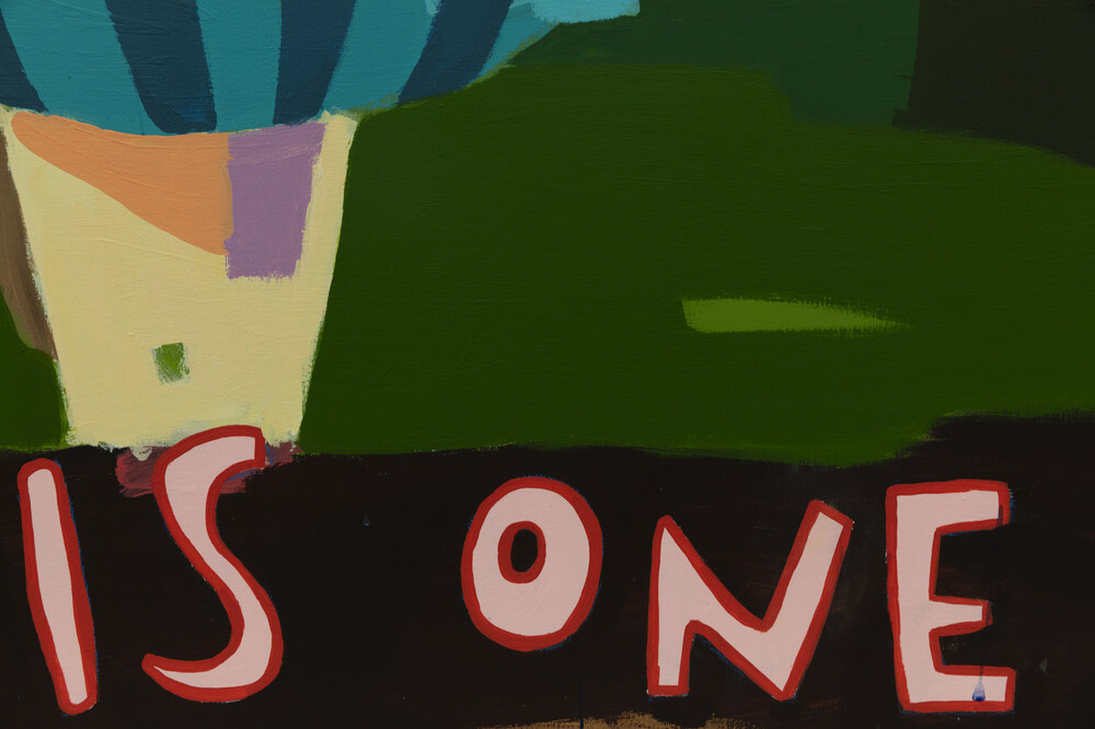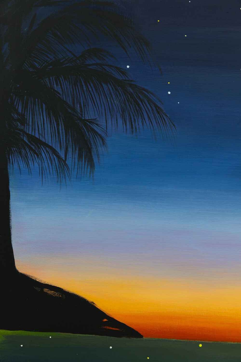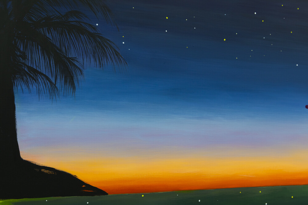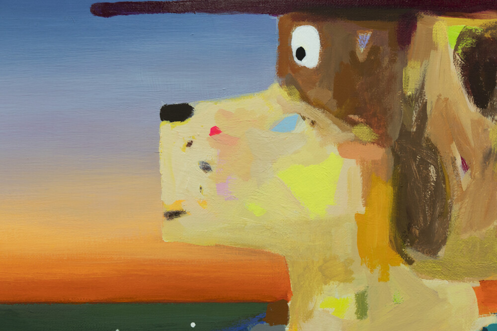 이 작품은 낯설면서도 따뜻한 분위기를 지니고 있습니다. 화면 중심에는 줄무늬 옷을 입은 강아지가 노란색 바나나를 안고 서 있으며, 모자에는 “LOST”라는 단어가 적혀 있습니다. 강아지 앞에는 오리가 말을 건네는 듯한 자세로 서 있습니다. 두 존재 사이에는 바다인지 우주인지 모호한 공간이 펼쳐지고 있으며, 배경에는 별이 떠 있는 깊은 밤이 이어집니다. 그러나 제목처럼 달은 보이지 않습니다.