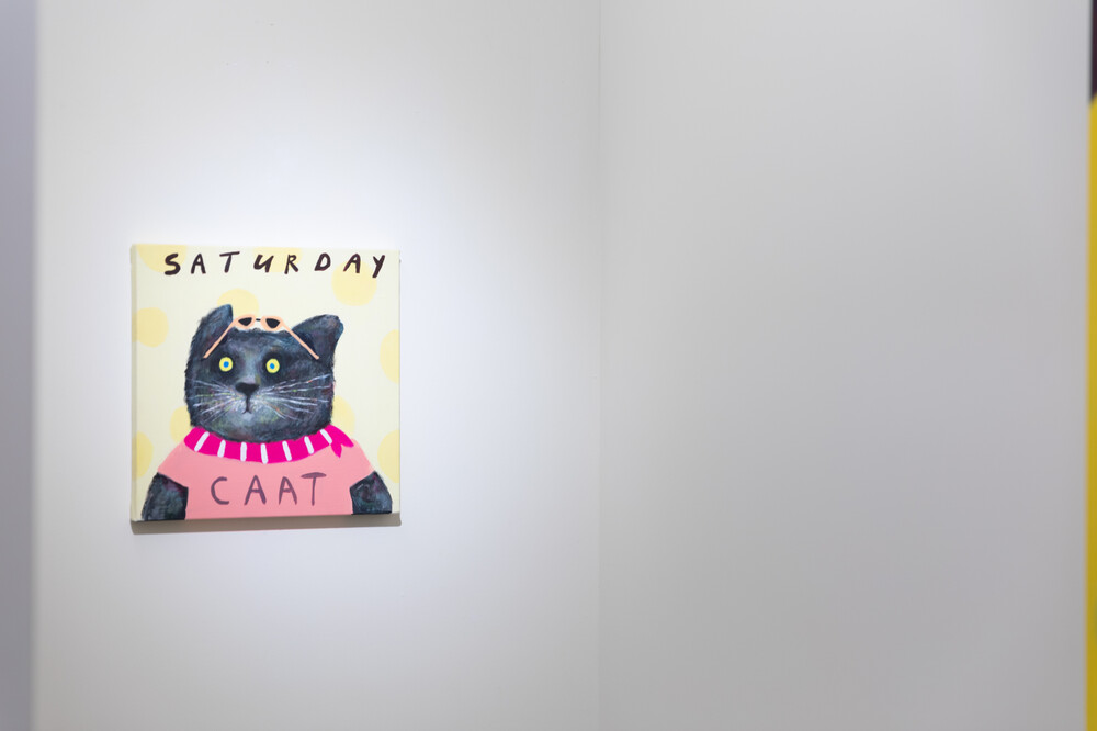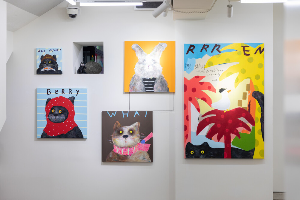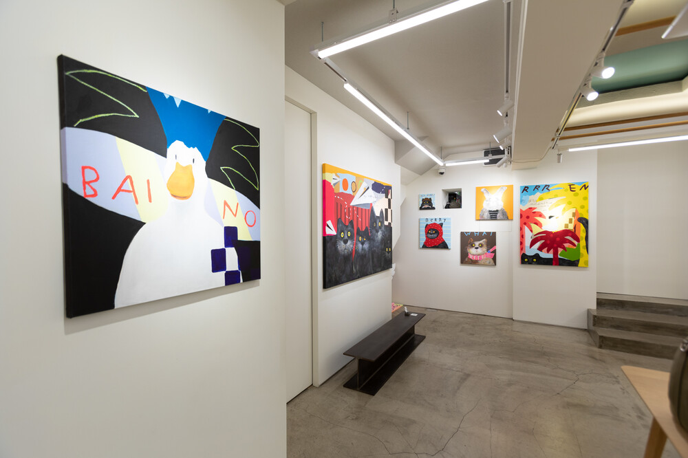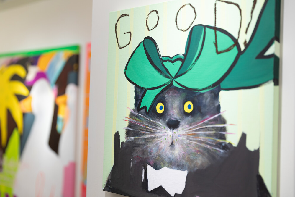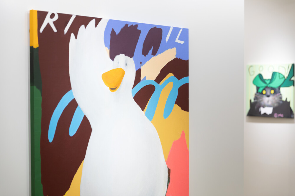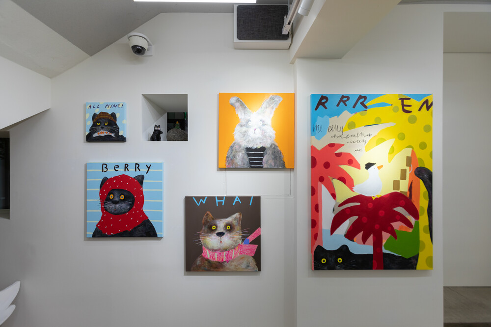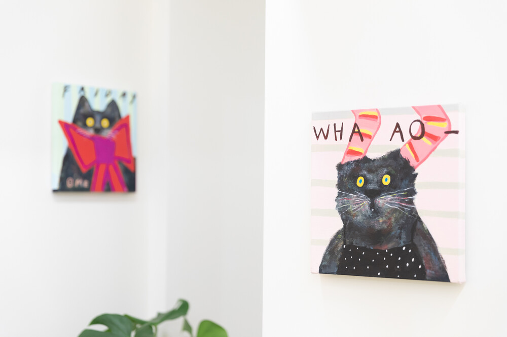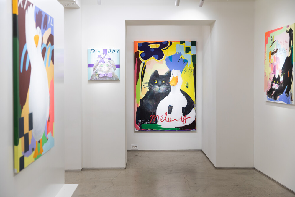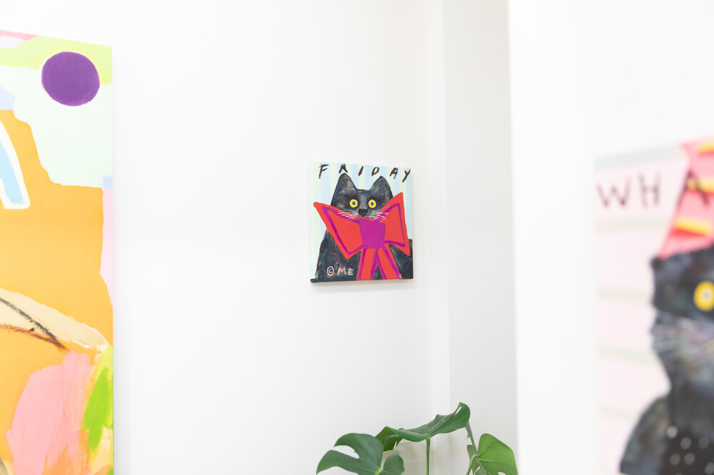 박소현 작가님은 즉흥적이고 순간적인 페인팅 기법과 키치하고 팝한 컬러와 무드로 사랑스러운 동물들을 의인화 하여 작가의 상상 속 기발한 이야기를 펼치고 있습니다. 캔버스 속 동물들은 관객에게 무엇인가를 이야기하고싶어하는 듯 한 느낌을 자아내어 보는 이의 호기심을 자극합니다. 작품의 제목 < oh >와 캔버스 속 고양이의 표정이 묘하게 매치되어 입가에 미소가 지어지는 작품입니다. 작품 위 레터링과 딸기를 연상케하는 화면구성 역시 작품을 이루는 다채로운 요소들의 매력을 배가 시키고 있습니다.