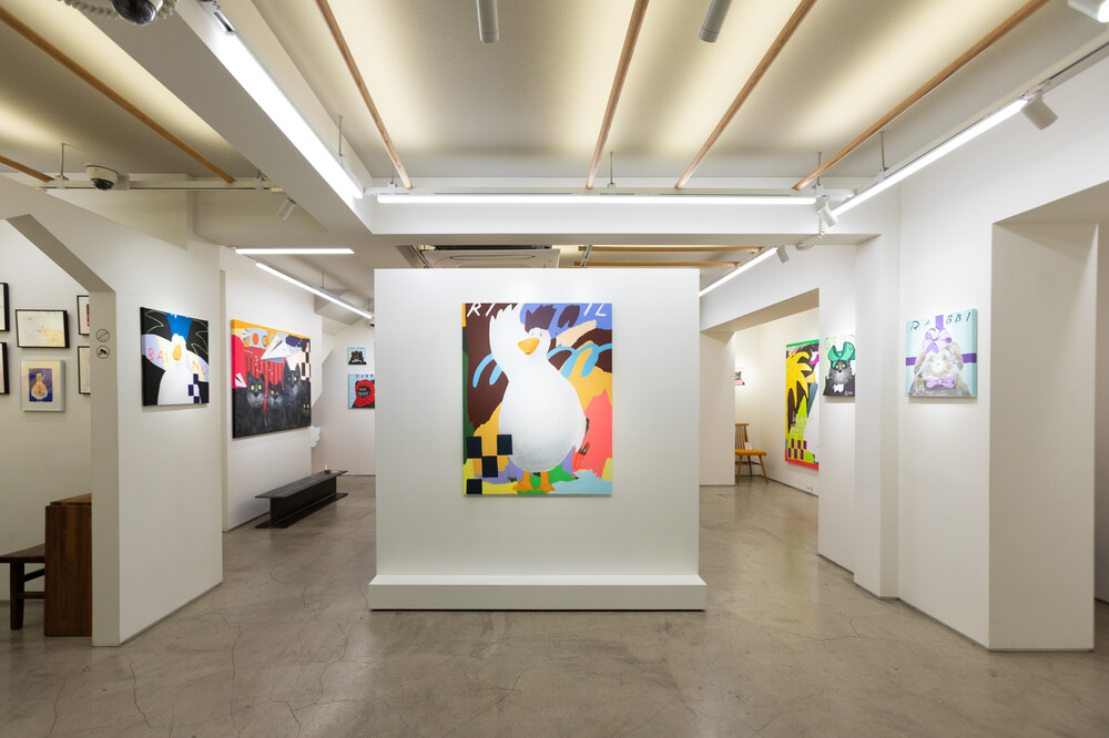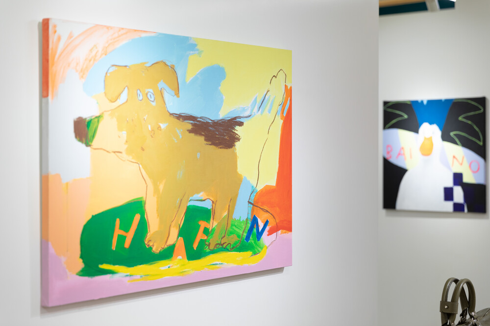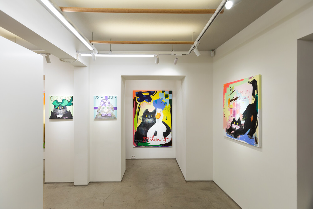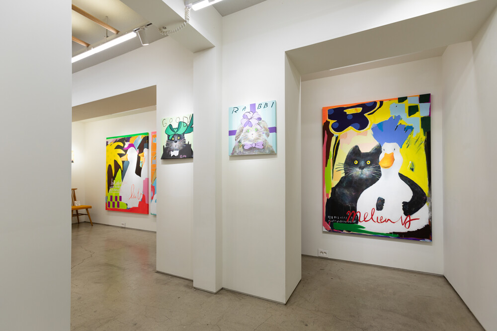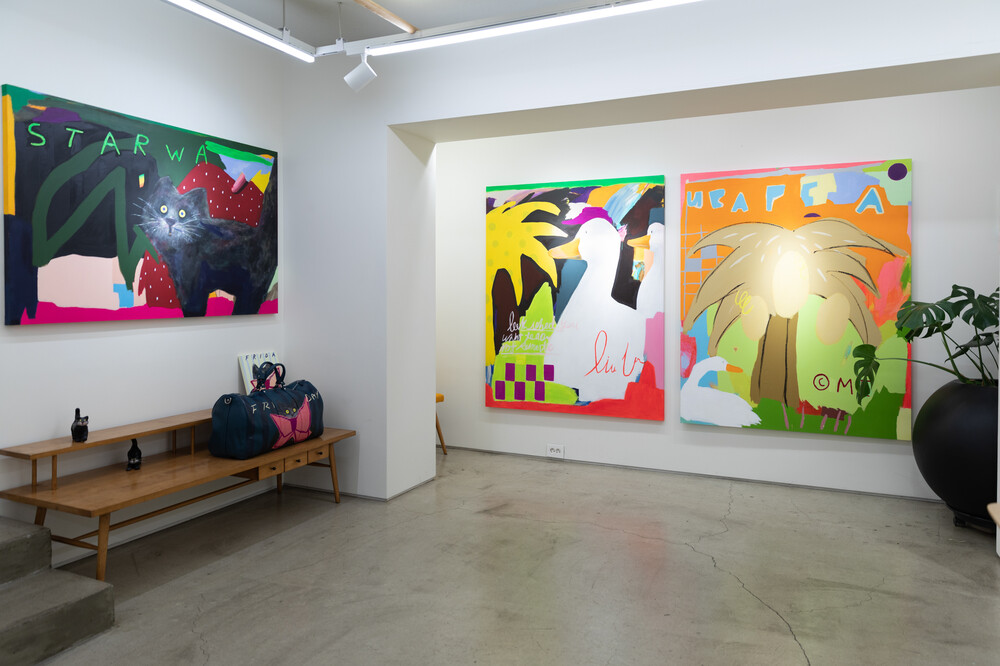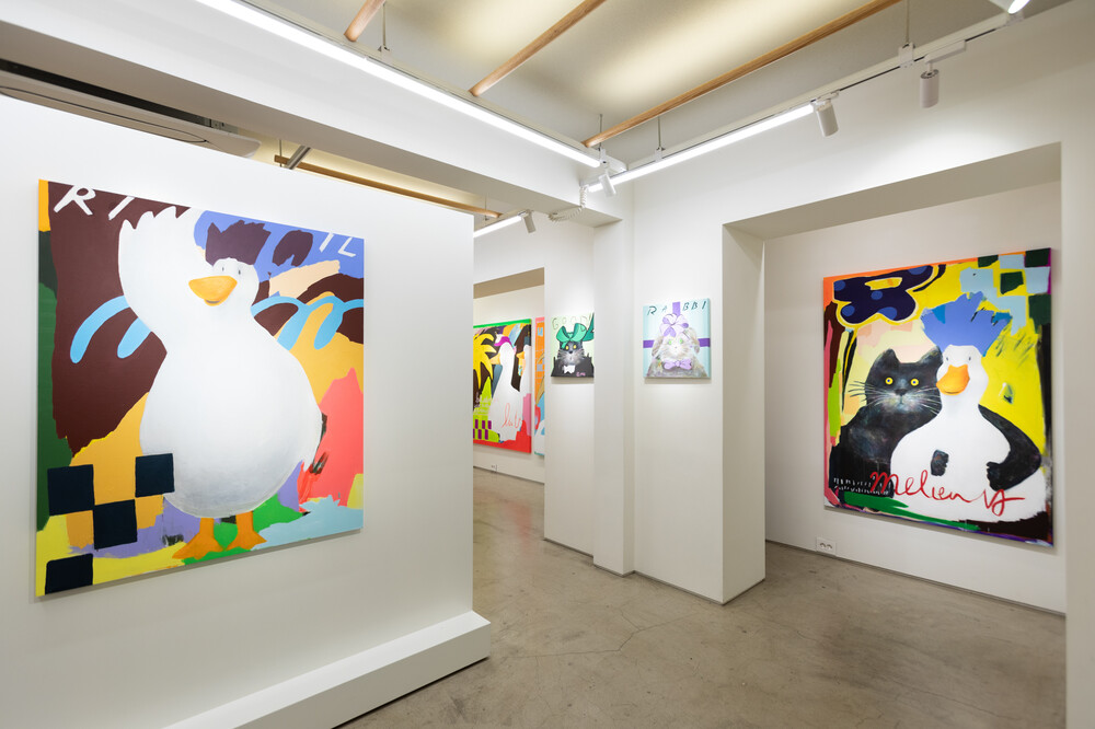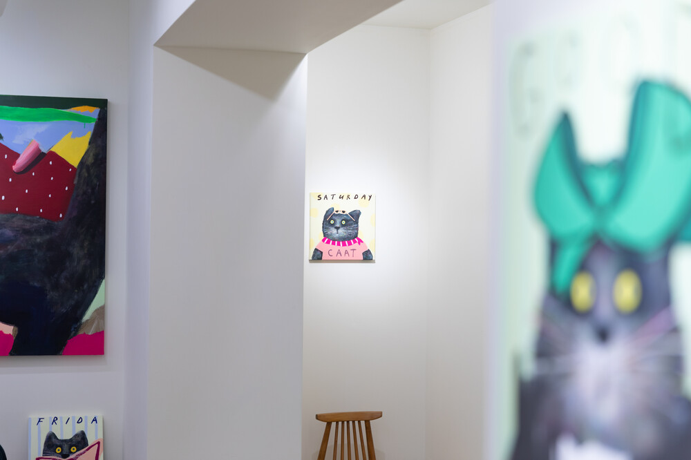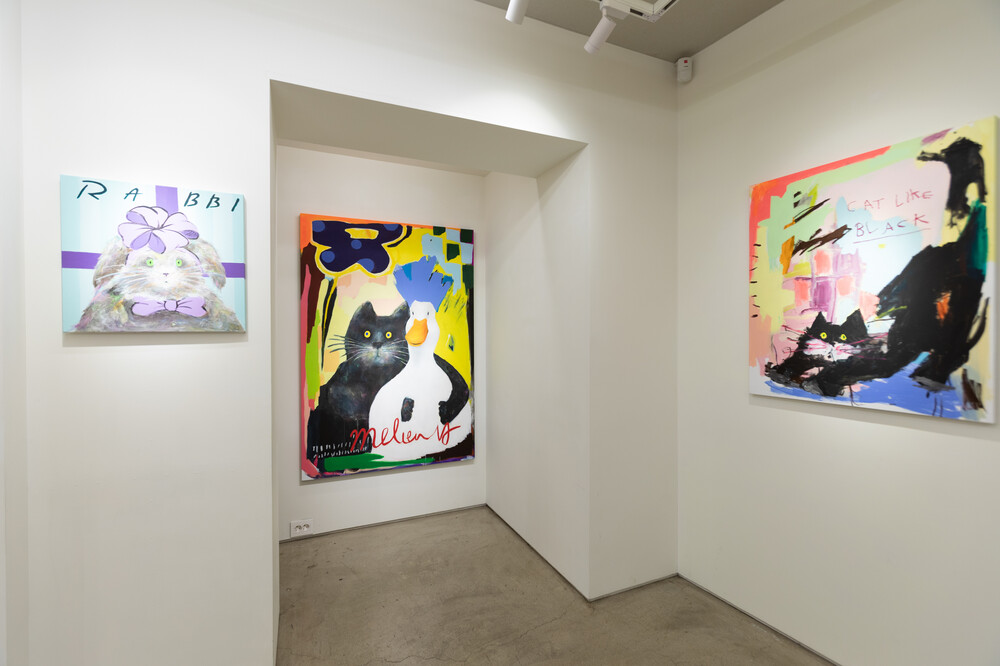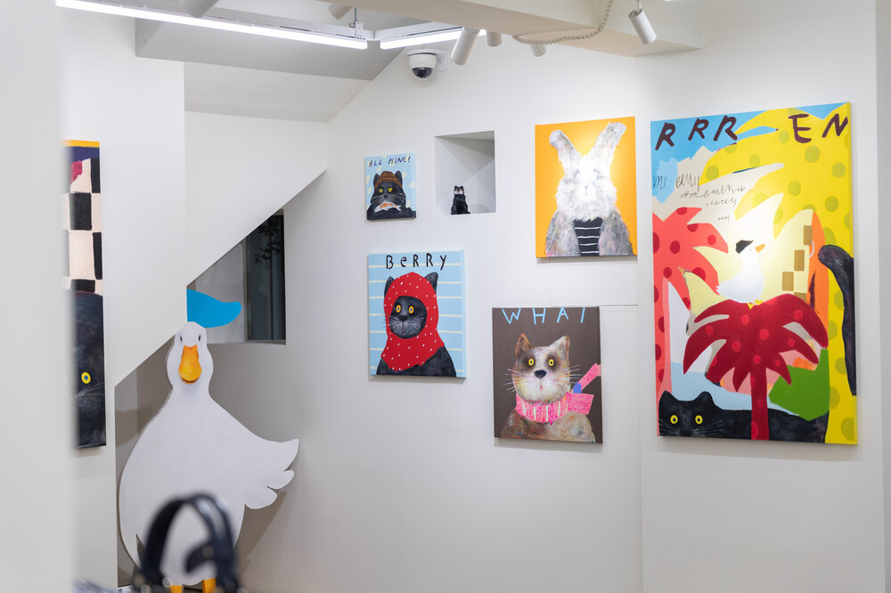 박소현 작가님은 즉흥적이고 순간적인 페인팅 기법과 키치하고 팝한 컬러와 무드로 사랑스러운 동물들을 의인화 하여 작가의 상상 속 기발한 이야기를 펼치고 있습니다. 캔버스 속 동물들은 관객에게 무엇인가를 이야기하고싶어하는 듯 한 느낌을 자아내어 보는 이의 호기심을 자극합니다. 작품의 제목 < oh >와 캔버스 속 고양이의 표정이 묘하게 매치되어 입가에 미소가 지어지는 작품입니다. 작품 위 레터링과 딸기를 연상케하는 화면구성 역시 작품을 이루는 다채로운 요소들의 매력을 배가 시키고 있습니다.