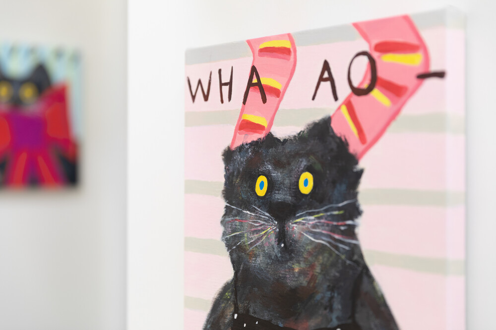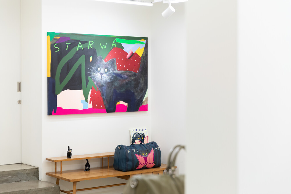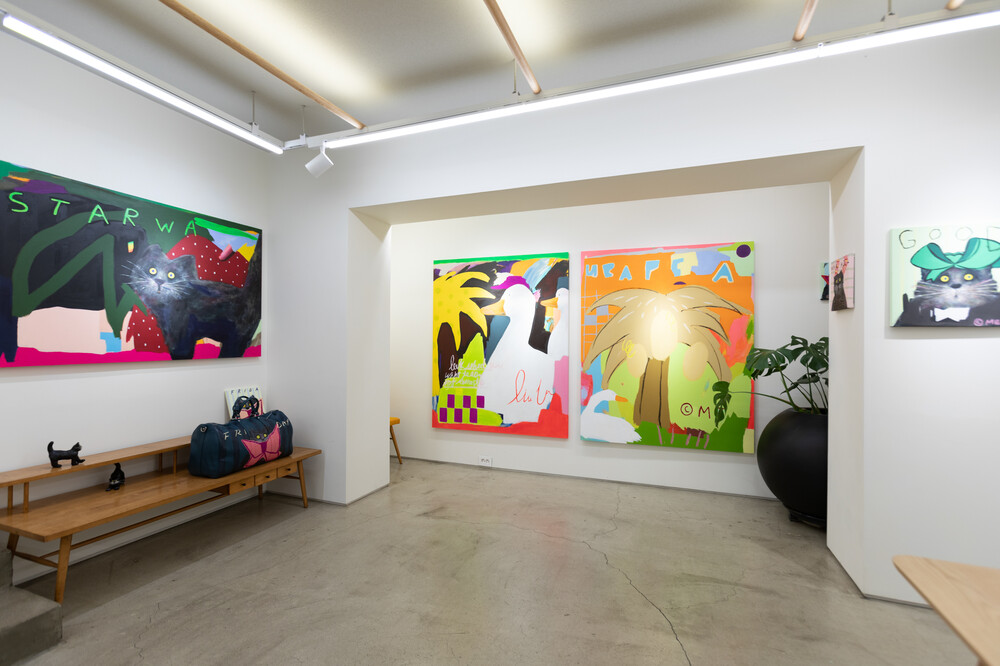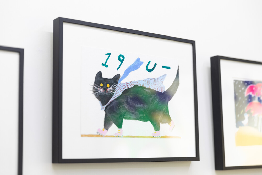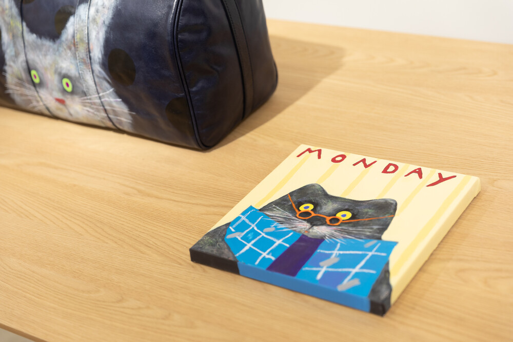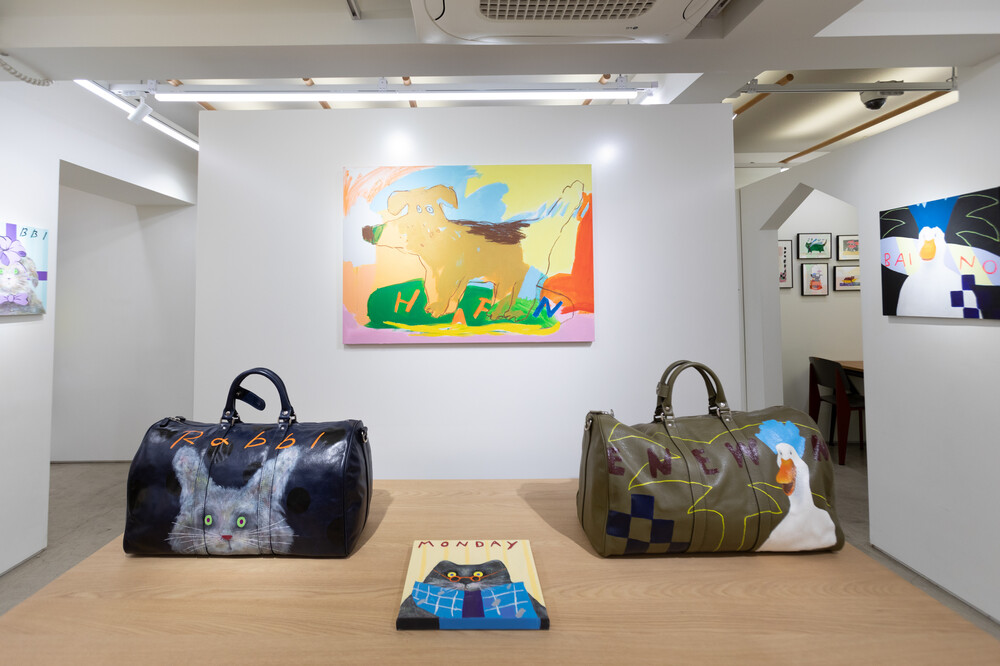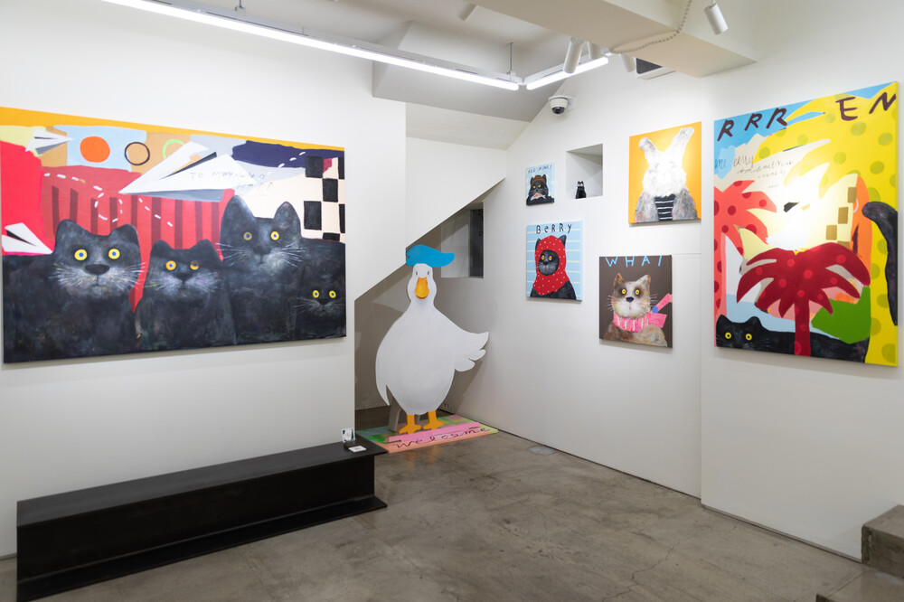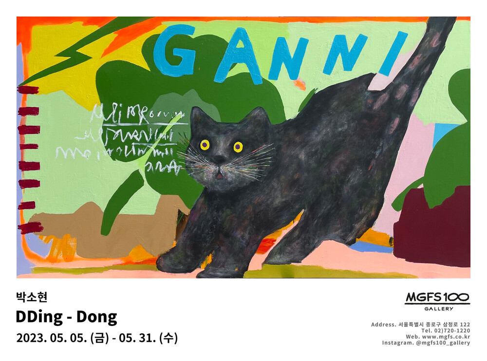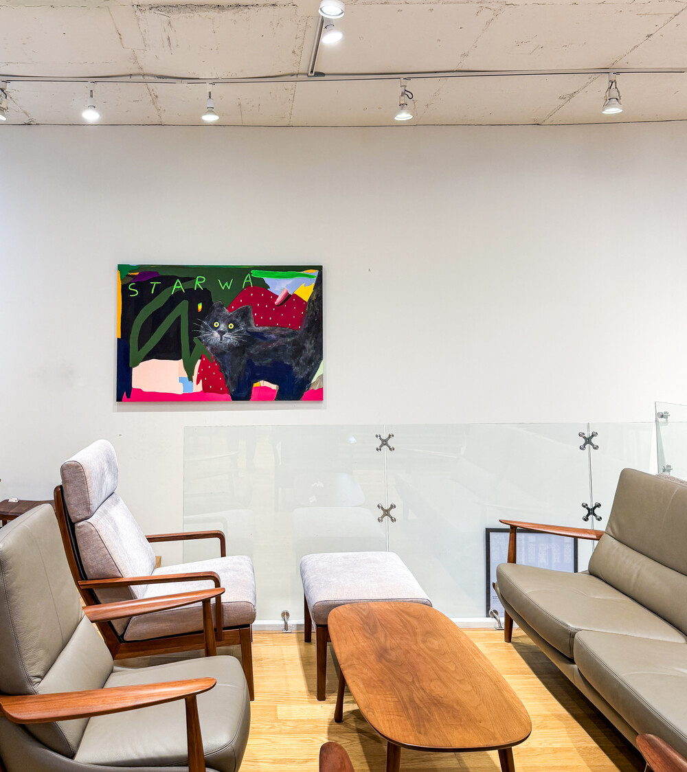 박소현 작가님은 즉흥적이고 순간적인 페인팅 기법과 키치하고 팝한 컬러와 무드로 사랑스러운 동물들을 의인화 하여 작가의 상상 속 기발한 이야기를 펼치고 있습니다. 캔버스 속 동물들은 관객에게 무엇인가를 이야기하고싶어하는 듯 한 느낌을 자아내어 보는 이의 호기심을 자극합니다. 작품의 제목 < oh >와 캔버스 속 고양이의 표정이 묘하게 매치되어 입가에 미소가 지어지는 작품입니다. 작품 위 레터링과 딸기를 연상케하는 화면구성 역시 작품을 이루는 다채로운 요소들의 매력을 배가 시키고 있습니다.