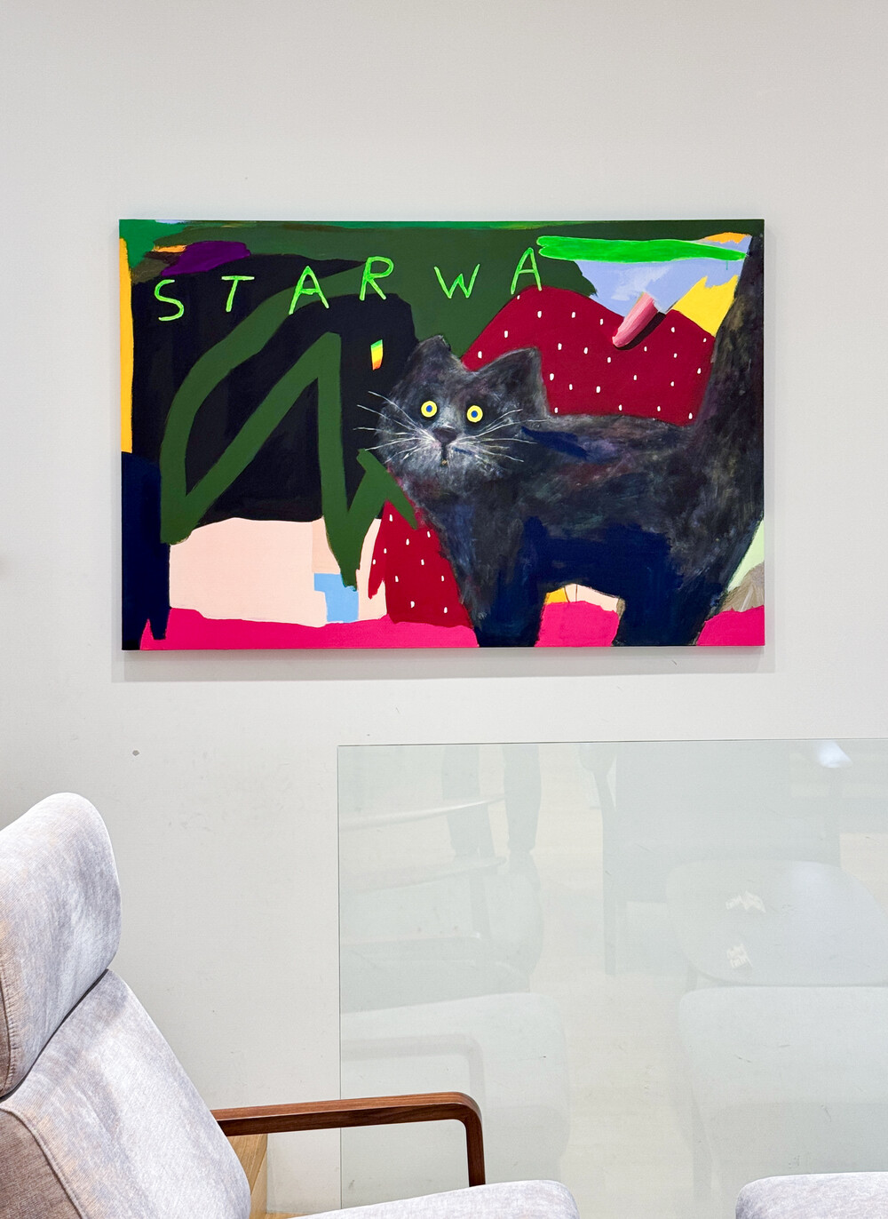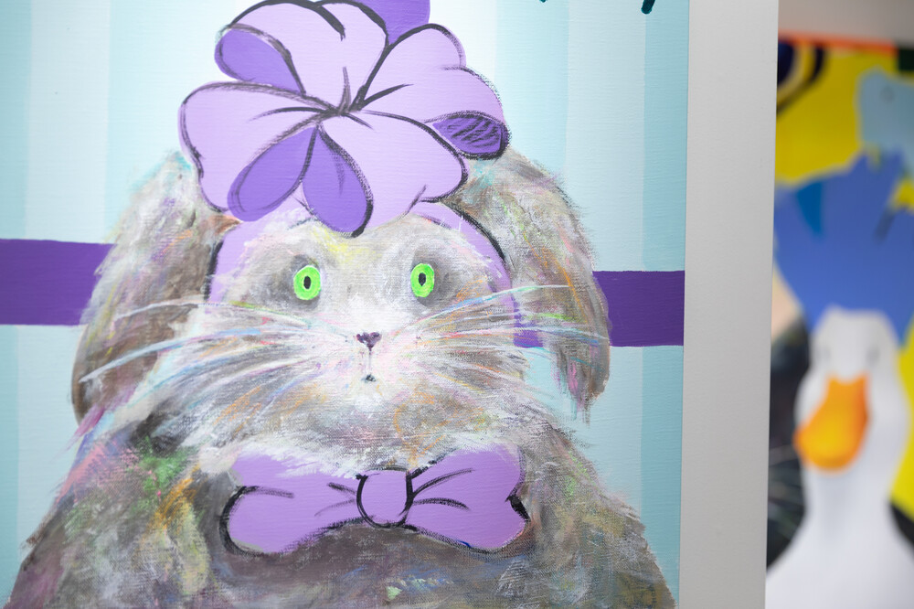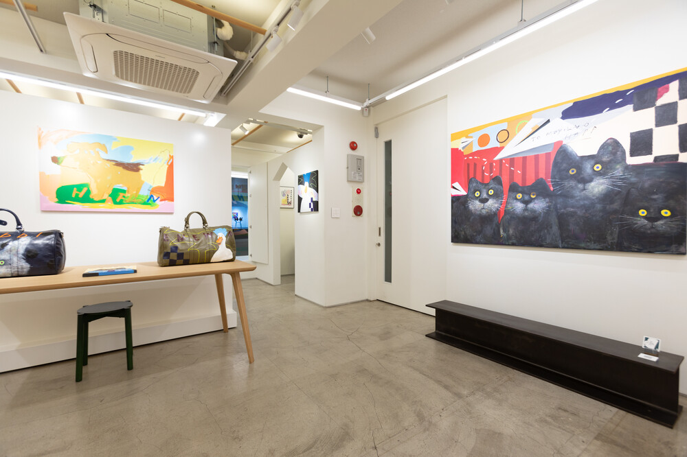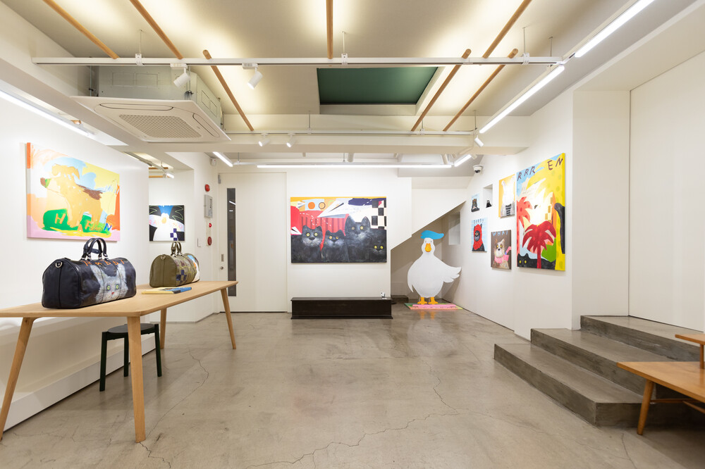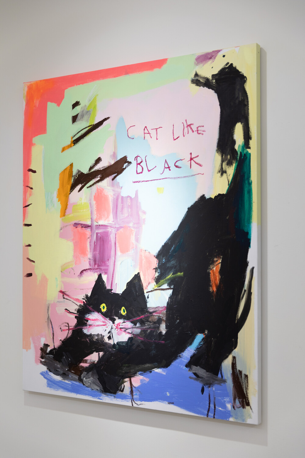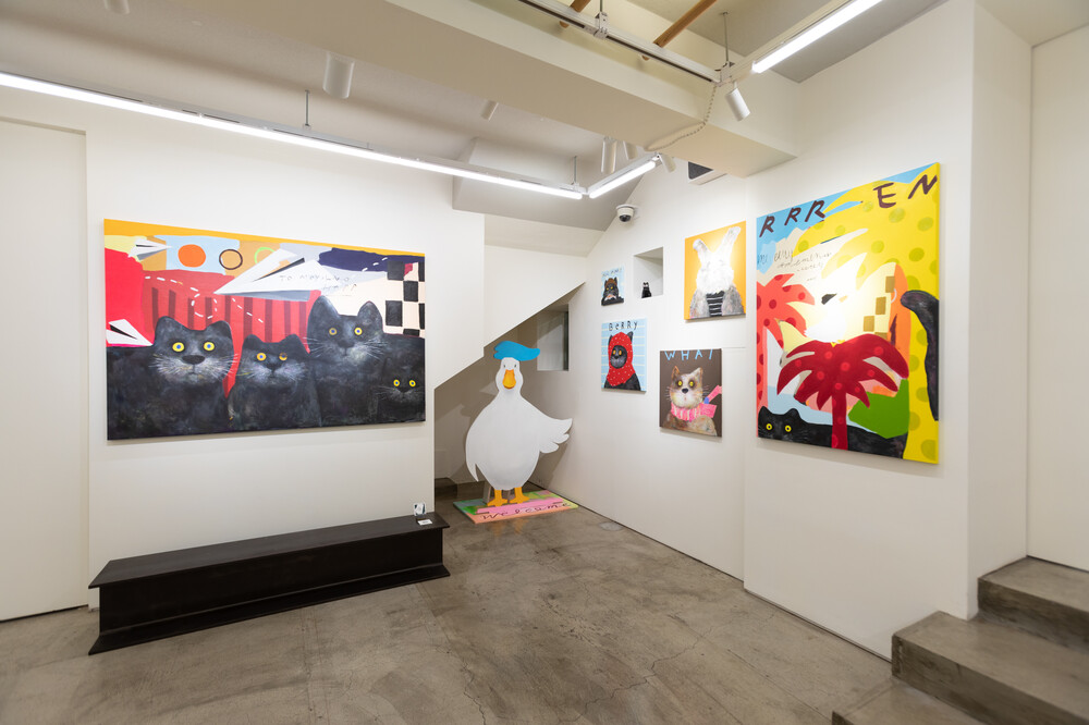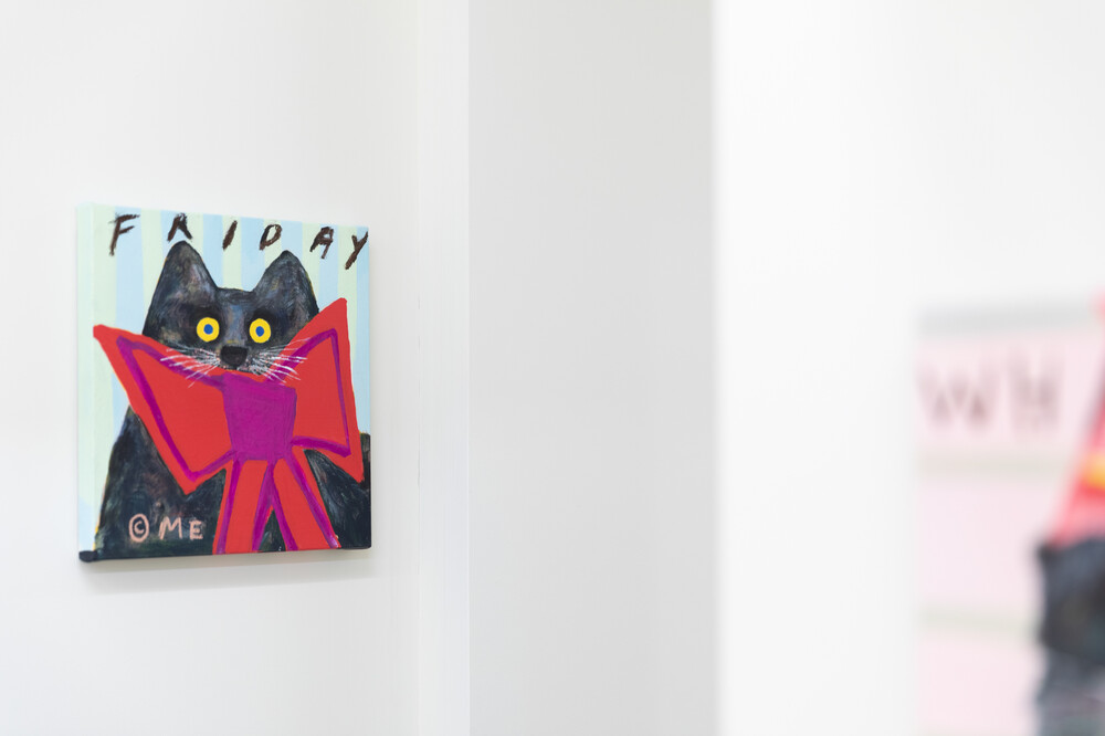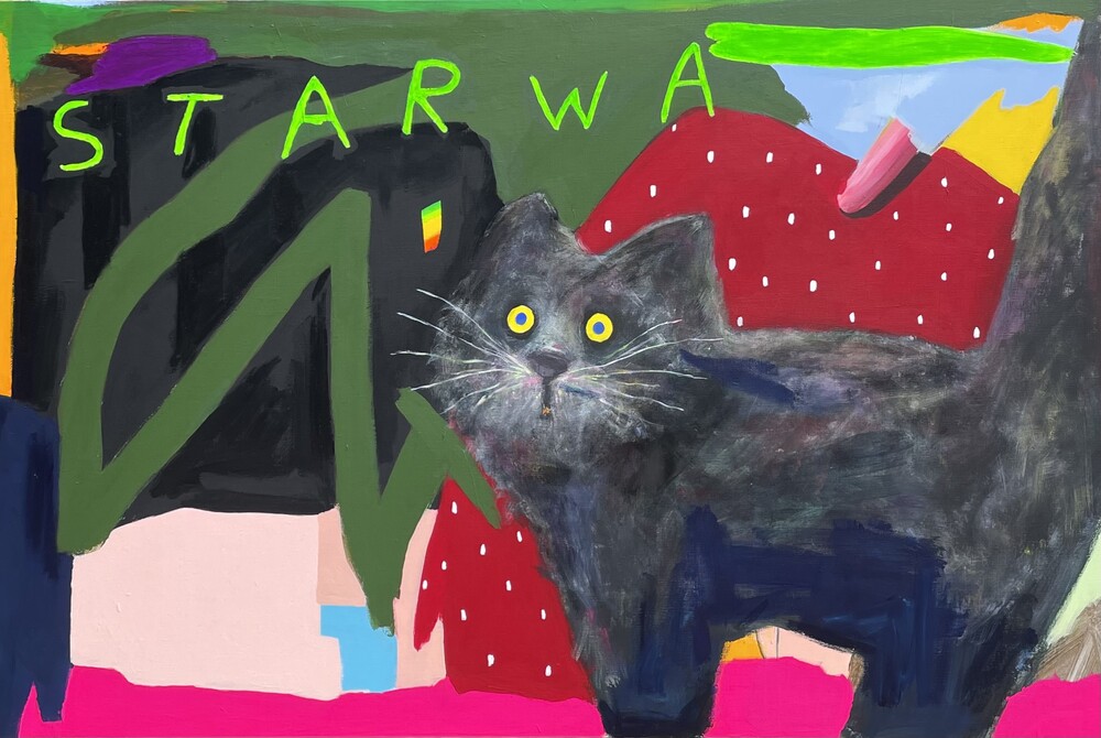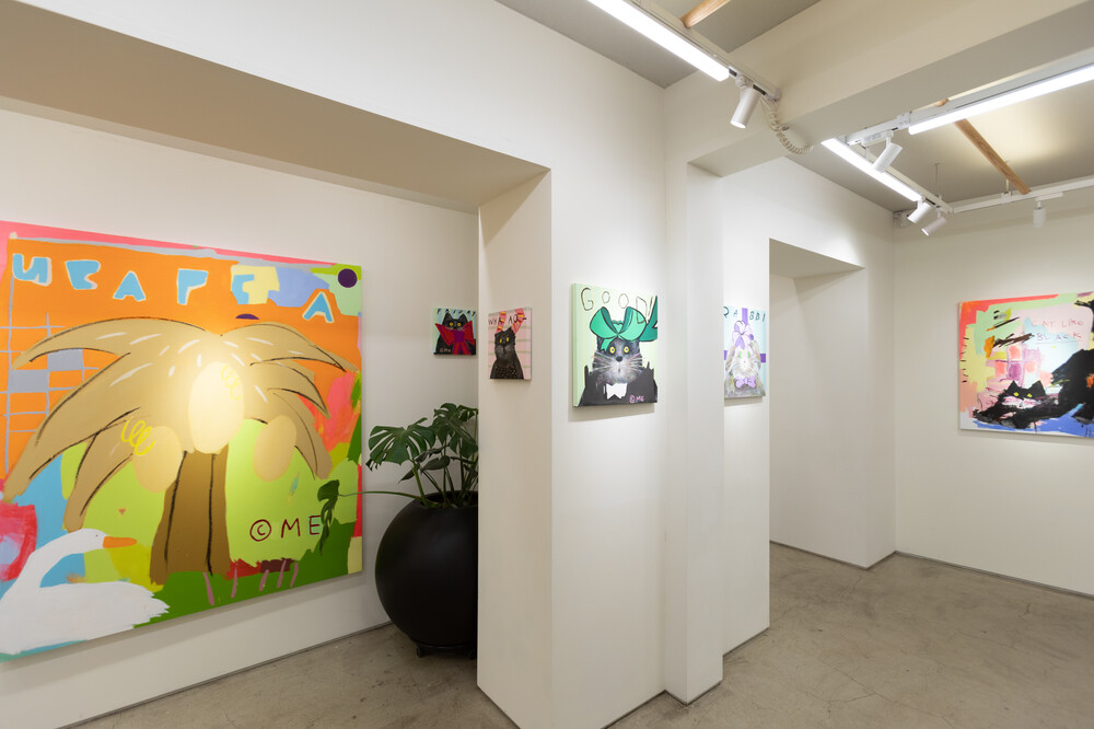 박소현 작가님은 즉흥적이고 순간적인 페인팅 기법과 키치하고 팝한 컬러와 무드로 사랑스러운 동물들을 의인화 하여 작가의 상상 속 기발한 이야기를 펼치고 있습니다. 캔버스 속 동물들은 관객에게 무엇인가를 이야기하고싶어하는 듯 한 느낌을 자아내어 보는 이의 호기심을 자극합니다. 작품의 제목 < oh >와 캔버스 속 고양이의 표정이 묘하게 매치되어 입가에 미소가 지어지는 작품입니다. 작품 위 레터링과 딸기를 연상케하는 화면구성 역시 작품을 이루는 다채로운 요소들의 매력을 배가 시키고 있습니다.