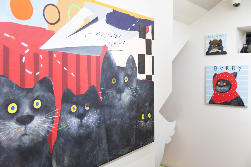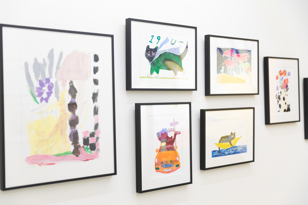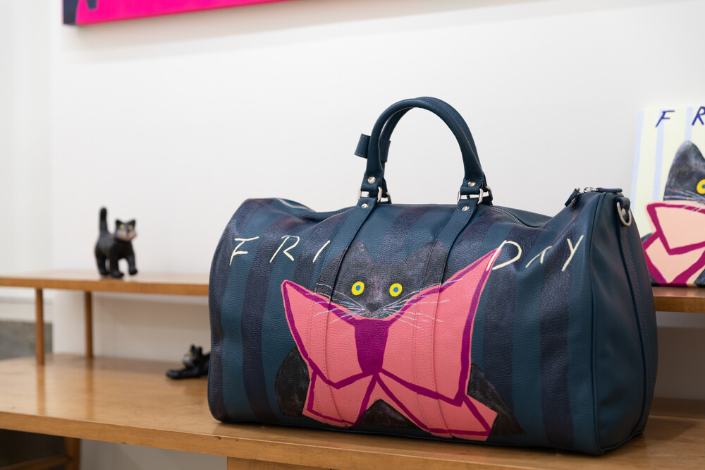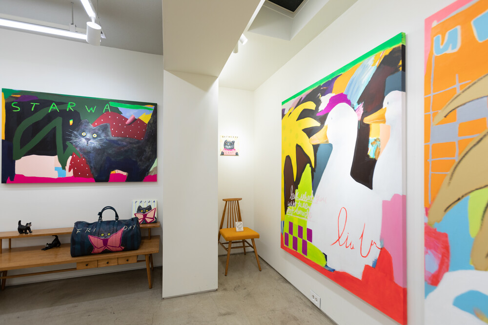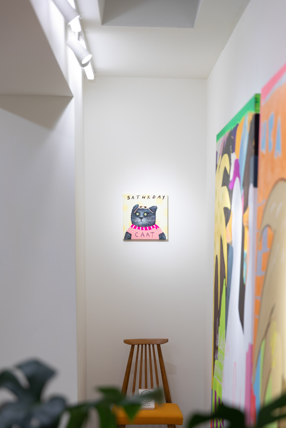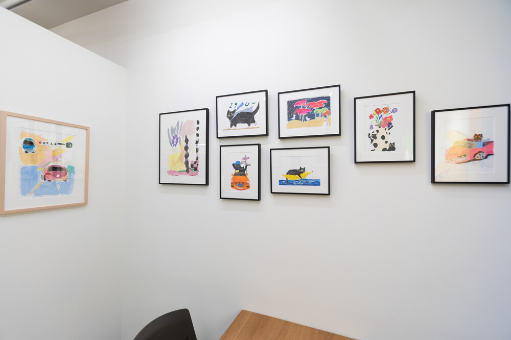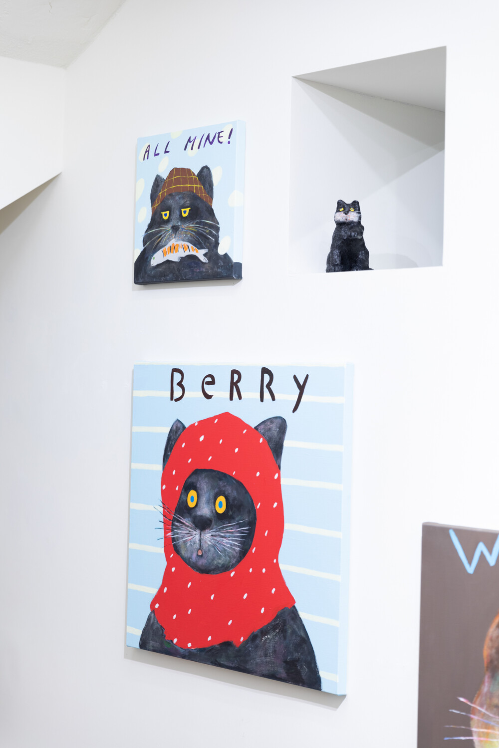 박소현 작가님은 즉흥적이고 순간적인 페인팅 기법과 키치하고 팝한 컬러와 무드로 사랑스러운 동물들을 의인화 하여 작가의 상상 속 기발한 이야기를 펼치고 있습니다. 캔버스 속 동물들은 관객에게 무엇인가를 이야기하고싶어하는 듯 한 느낌을 자아내어 보는 이의 호기심을 자극합니다. 작품의 제목 < oh >와 캔버스 속 고양이의 표정이 묘하게 매치되어 입가에 미소가 지어지는 작품입니다. 작품 위 레터링과 딸기를 연상케하는 화면구성 역시 작품을 이루는 다채로운 요소들의 매력을 배가 시키고 있습니다.