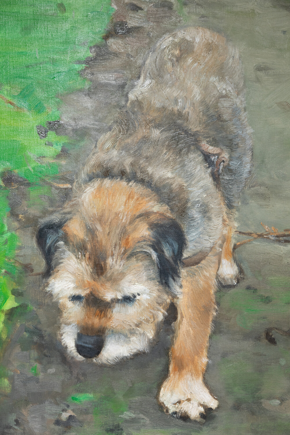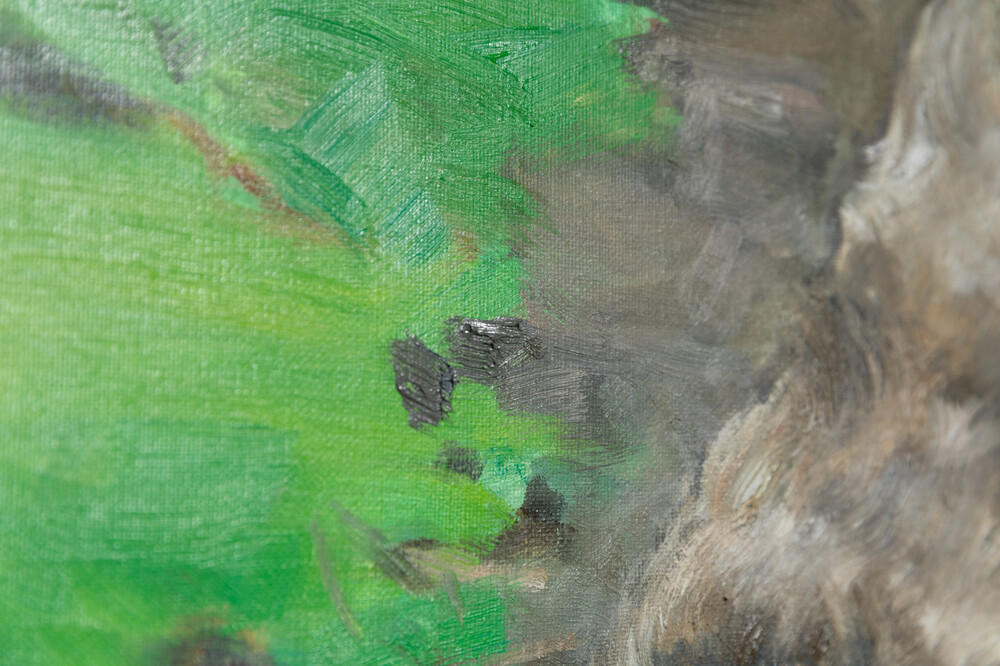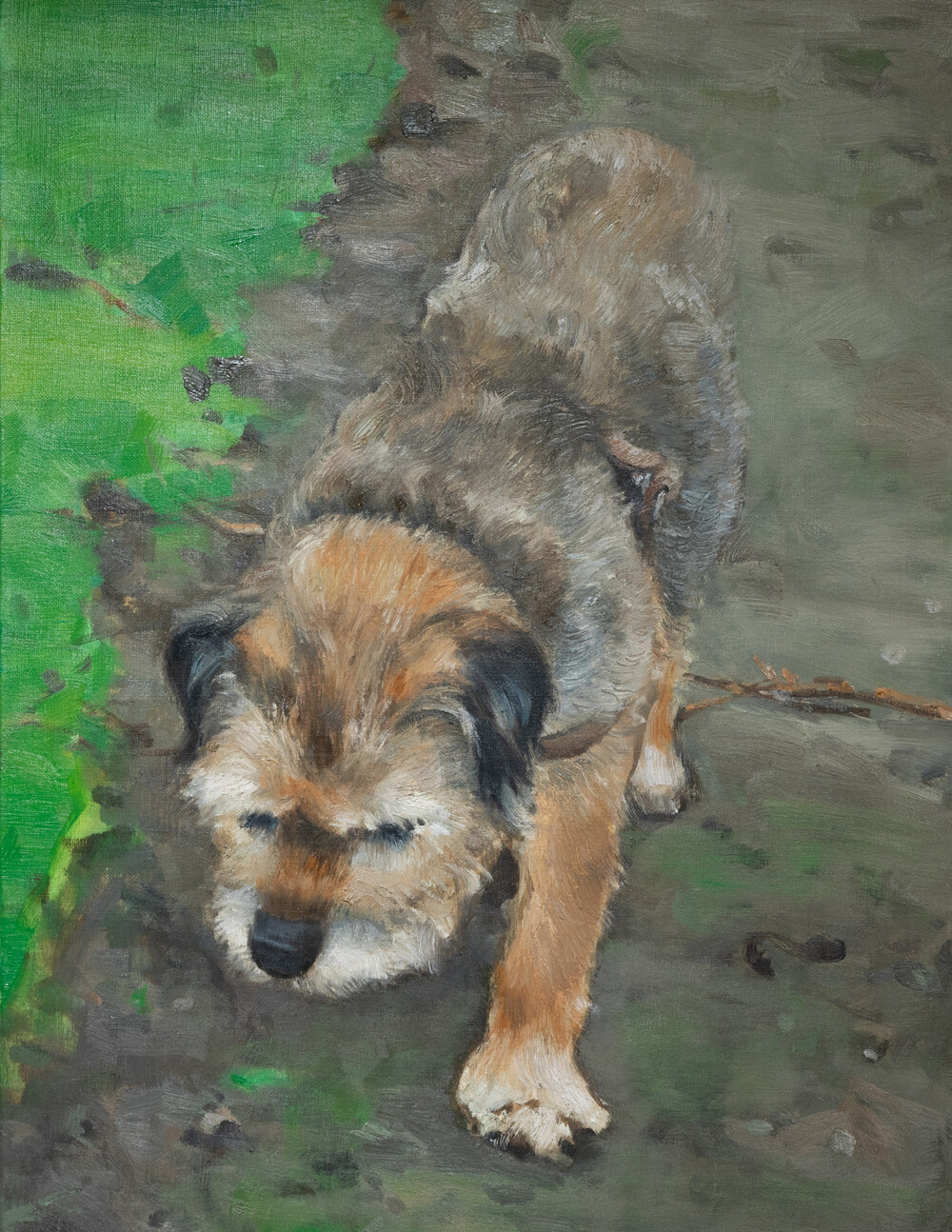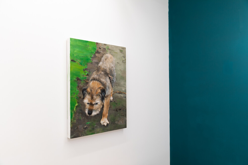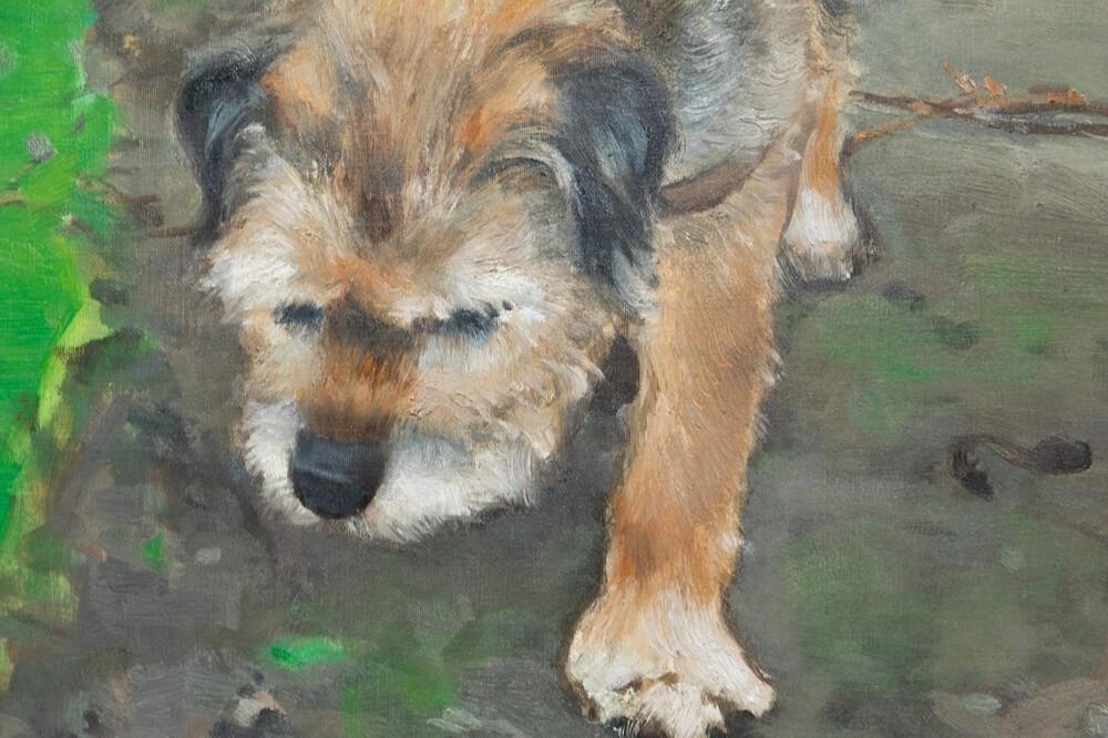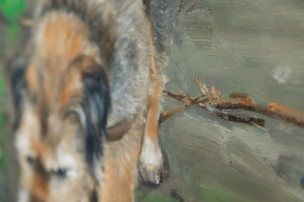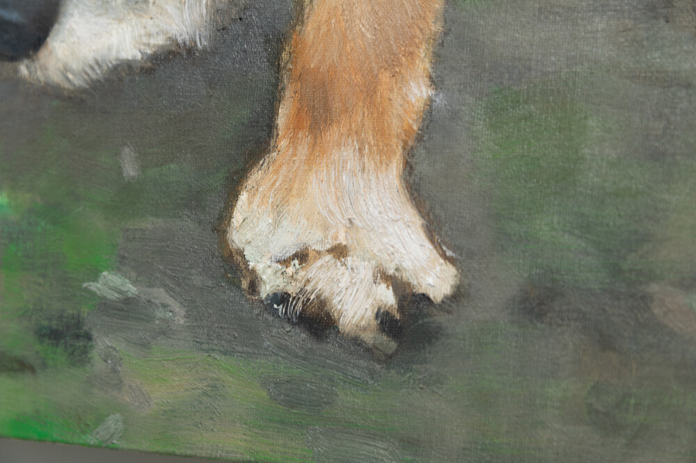최승준 작가의 작품 <Old Dog>는 2017년 프랑스 파리의 어느 비 오는 날에 만난 노견에게서 느낀 삶의 연륜과 지혜를 포착한 작품입니다. 작가는 느린 걸음으로 비에 젖은 흙길을 걷는 강아지의 모습에서 무언지 모를 묘한 영감을 받아 강아지의 사진과 드로잉을 남긴 뒤 2020년에 캔버스 위 하나의 화폭으로 표현하였습니다.
