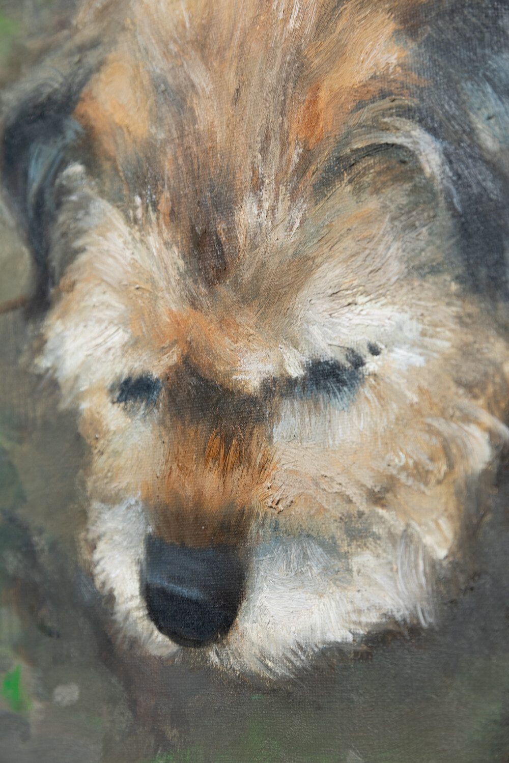 강아지를 뒤덮고있는 뭉성한 털은 비에 젖어 무게를 지니며 나란히 늘어선 모습마저 섬세히 표현되었습니다. 갈색, 회색, 그리고 흰색의 털 사이로 비친 빛은 시간의 흐름을 은유하며 강아지의 눈빛 속에서는 묵직한 삶의 지혜와 연륜이 느껴집니다.