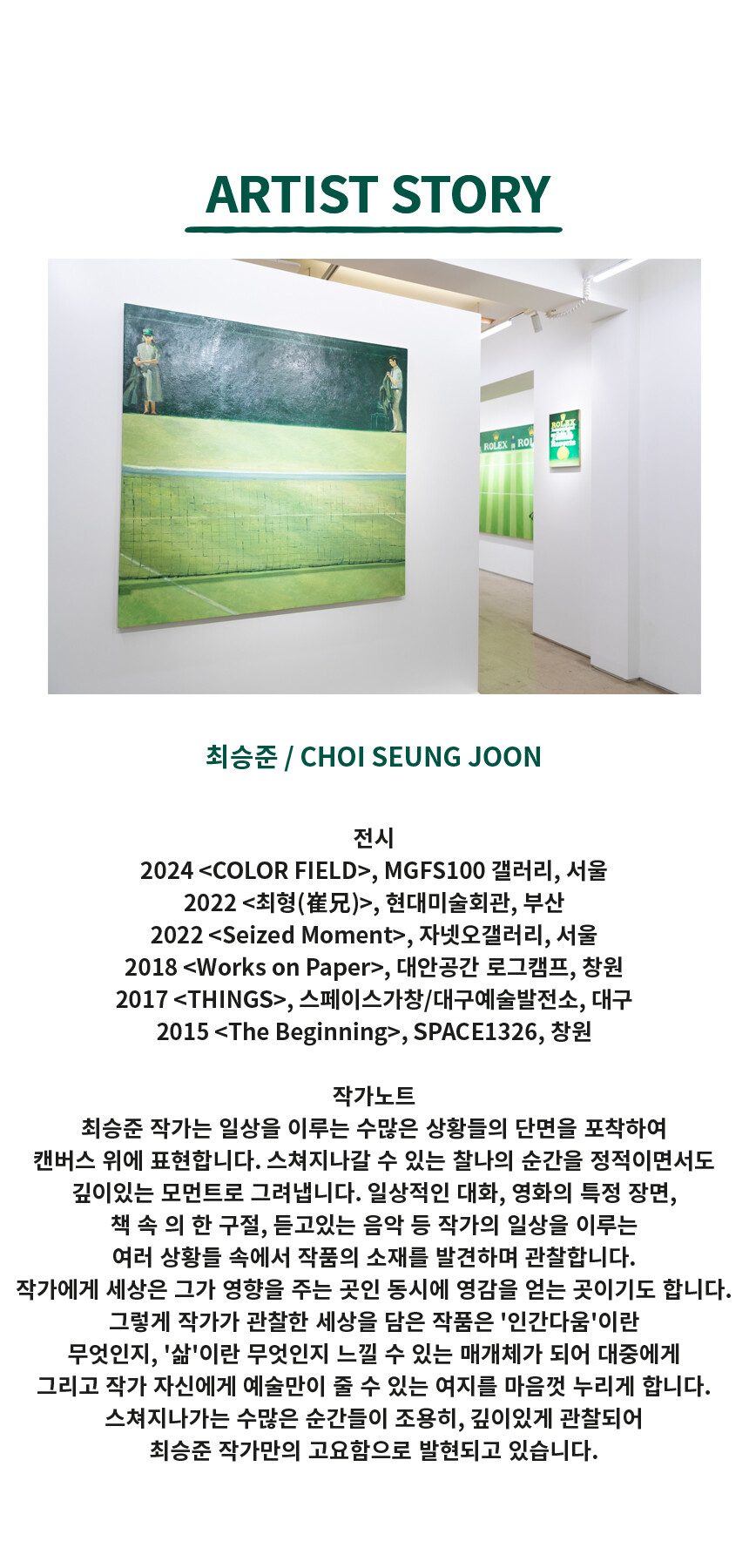 녹색으로 가득 찬 배경은 노견이 지나온 삶의 길목이자, 앞으로의 여정에 대한 희망과 기대를 상징하며, 비록 나이가 들었지만 여전히 강인한 생명력을 간직하고 있음을 암시하는 것만 같습니다. 최승준 작가의 <Old Dog>는 삶의 깊이와 아름다움을 담담하고도 풍부하게 담아내며, 관람자로 하여금 그 깊이에 공명하게 만듭니다. 이 작품과 함께 그 아름다운 여정에 동행해보시길 바랍니다.