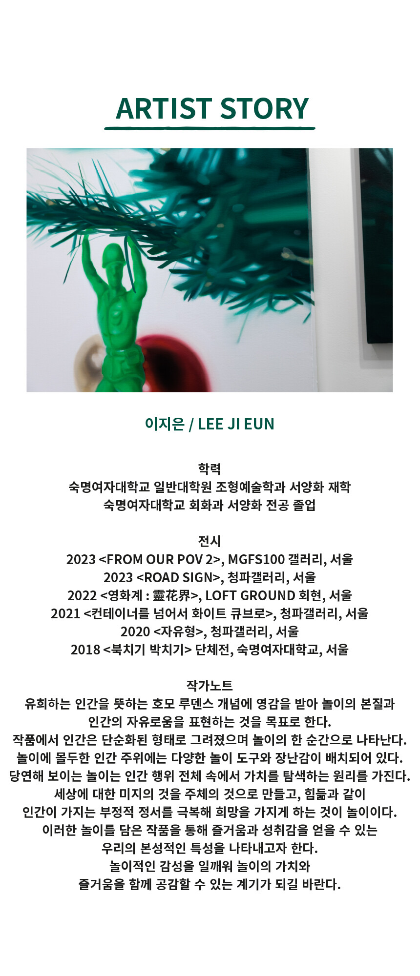 크리스마스 트리를 꾸미는 꼬마 병정의 '놀이'를 담은 이지은 작가의 작품 < 준비중 > 입니다. 이지은 작가는 '유희하는 인간'을 뜻하는 호모 루덴스의 개념에서 영감을 받아 자유를 추구하는 인간의 본능과 놀이의 본질을 표현한 '놀이하는 인간' 시리즈를 선보입니다. 단순하면서도 입체감있게 표현된 인물이 놀이에 몰두하고 있는 모습을 그려 인간에게 '놀이'라는 행위가 지닌 가치와 의미를 탐색합니다.