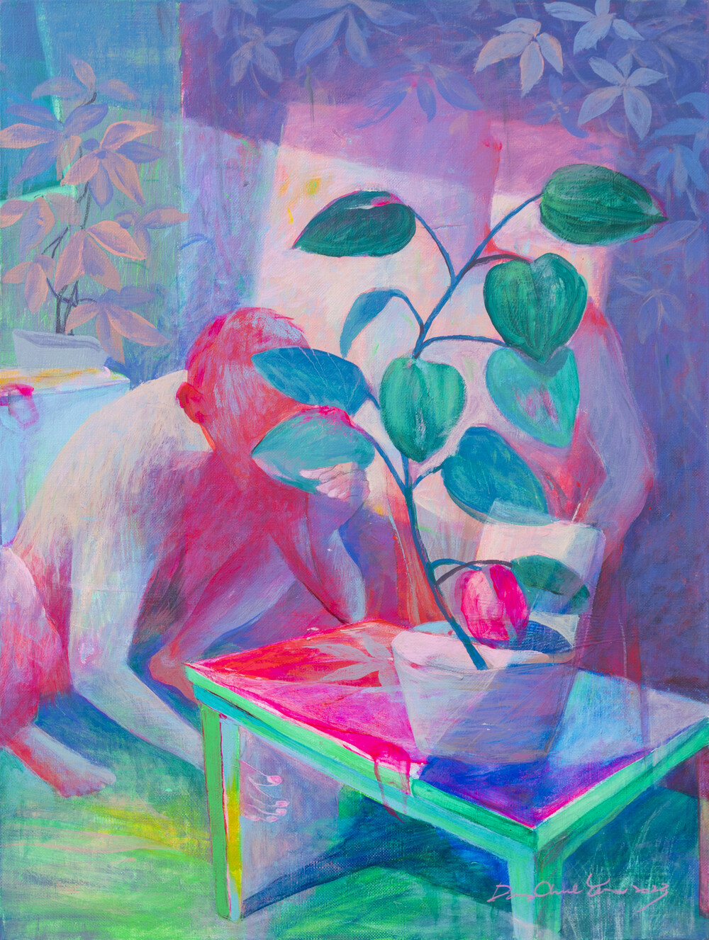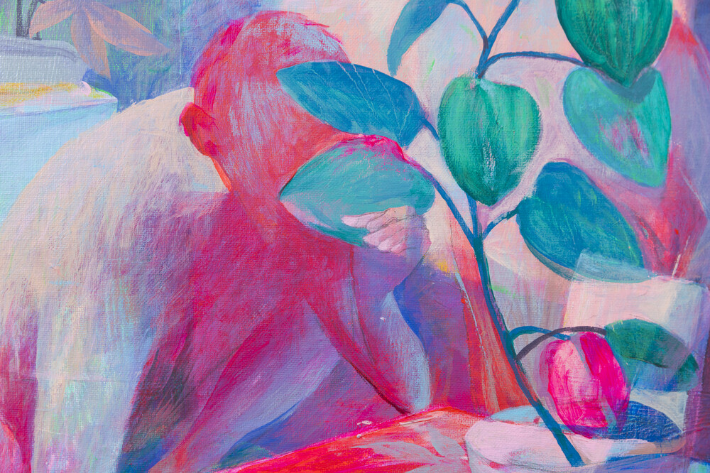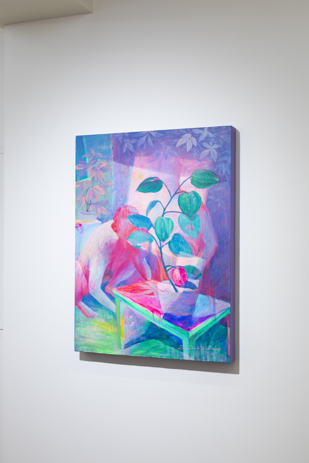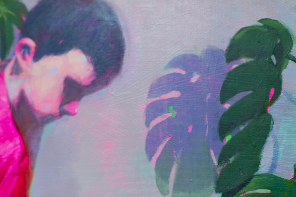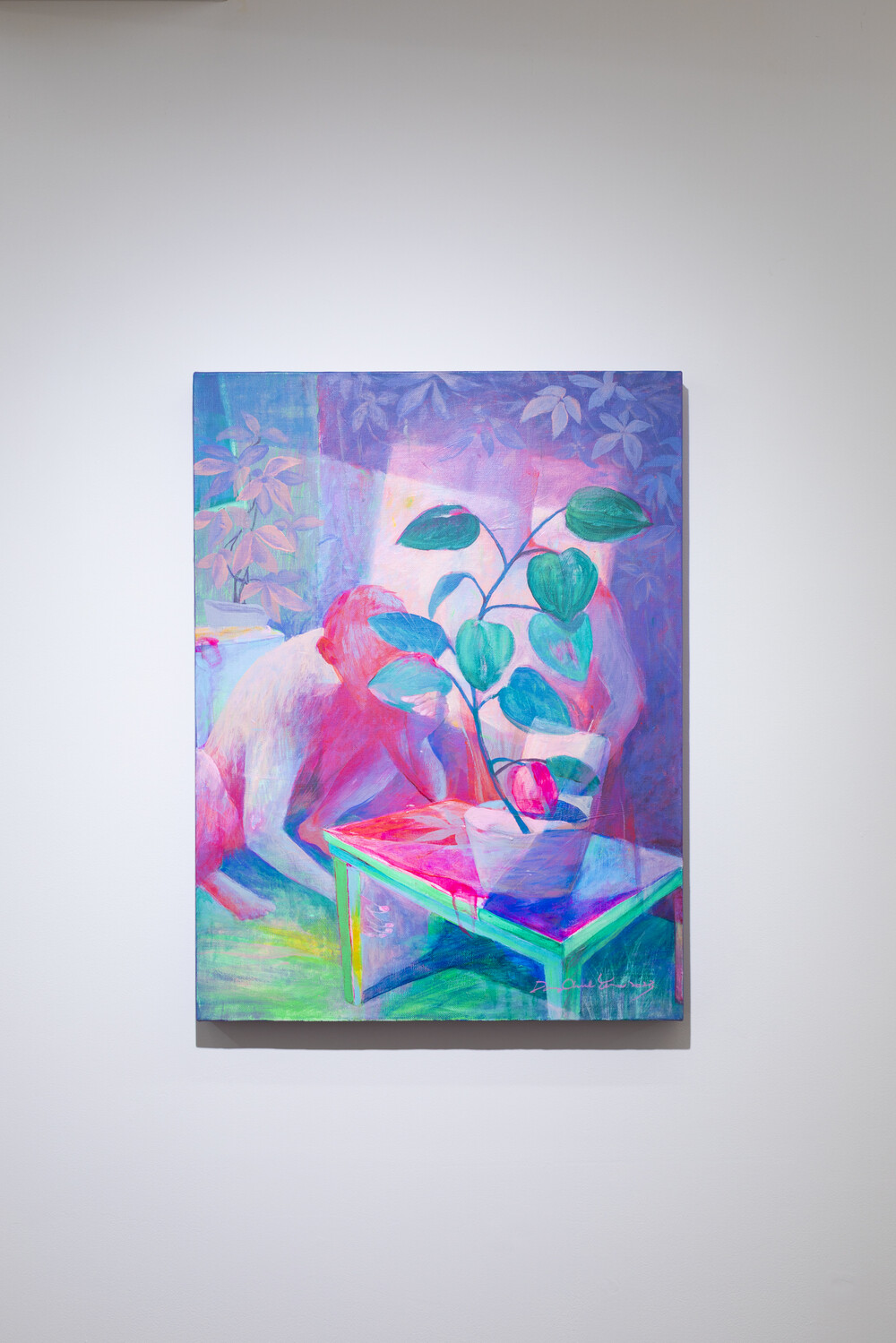 분홍빛이 화면을 가득 채운 캔버스 위에 두 사람이 앉아 있는 형체가 희미하게 드러나 있습니다. 인물들의 표정은 잘 보이지 않으나, 무언가를 깊이 생각하고 있는 듯 혹은 관찰하는 듯한 기묘한 기운이 감돕니다. 이들과 함께 놓인 식물의 싱그러움이 어우러져, 낯선 풍경이면서도 은근히 친근한 느낌을 자아냅니다. 작품을 마주하면 마치 꿈같은 오후 어느 순간으로 초대받은 기분이 들기도 합니다.