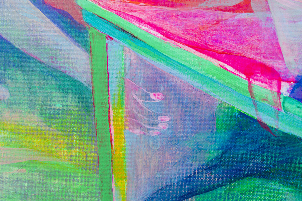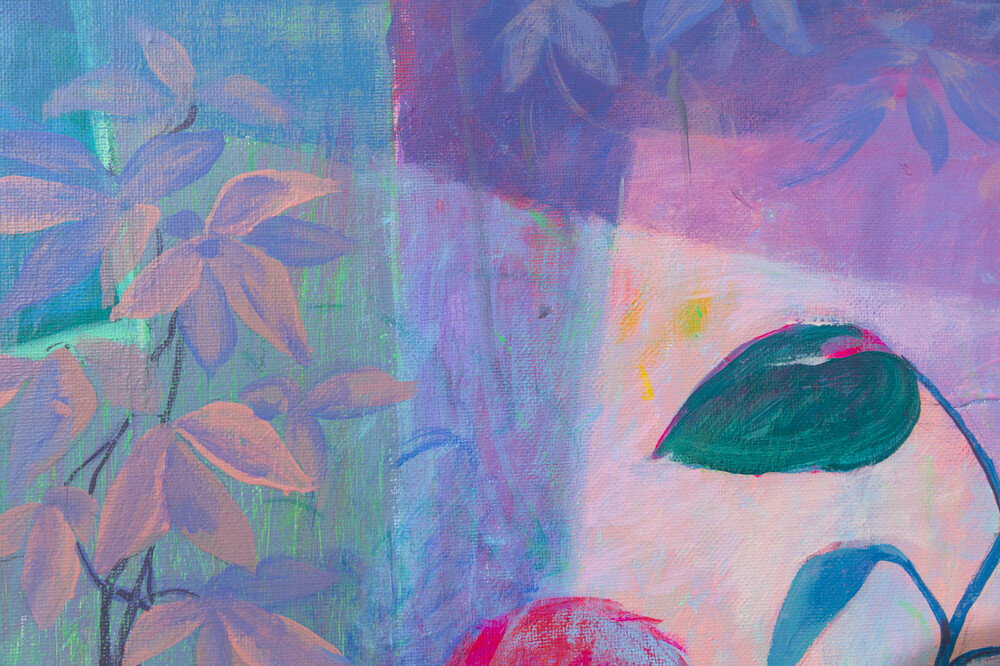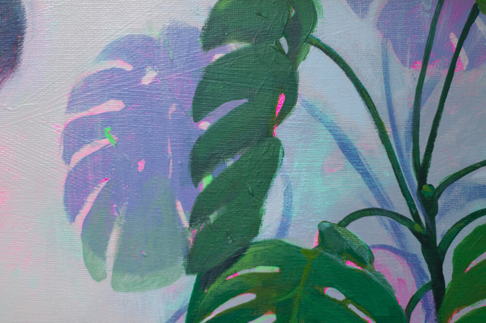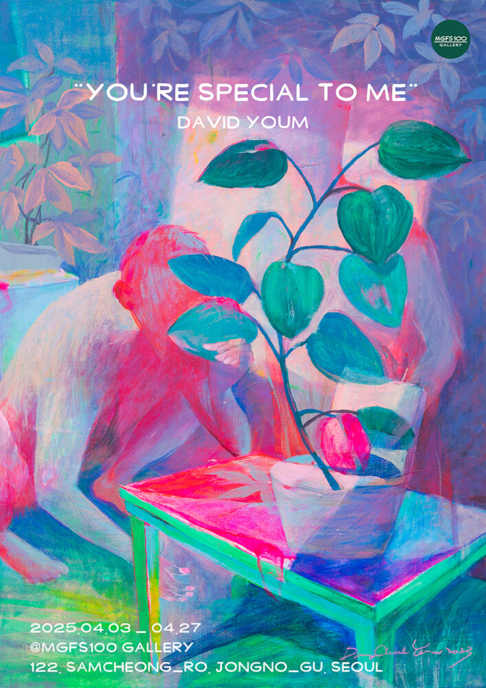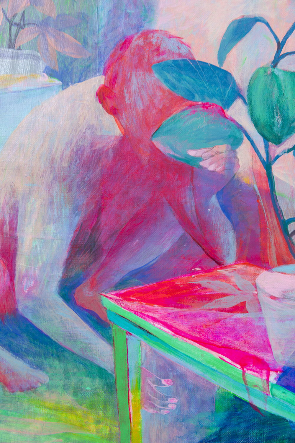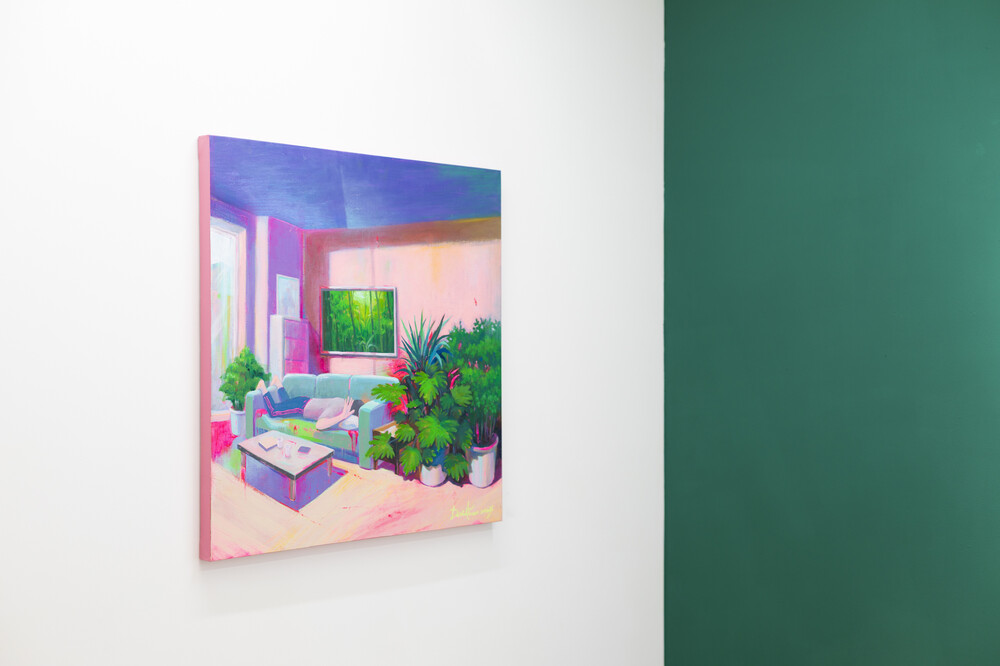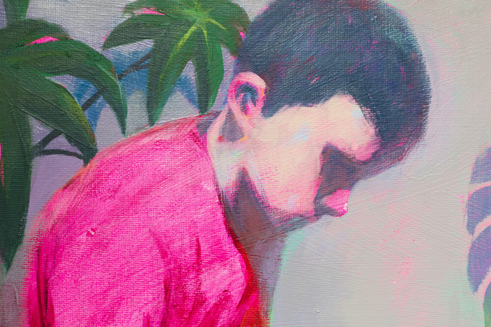 분홍빛이 화면을 가득 채운 캔버스 위에 두 사람이 앉아 있는 형체가 희미하게 드러나 있습니다. 인물들의 표정은 잘 보이지 않으나, 무언가를 깊이 생각하고 있는 듯 혹은 관찰하는 듯한 기묘한 기운이 감돕니다. 이들과 함께 놓인 식물의 싱그러움이 어우러져, 낯선 풍경이면서도 은근히 친근한 느낌을 자아냅니다. 작품을 마주하면 마치 꿈같은 오후 어느 순간으로 초대받은 기분이 들기도 합니다.