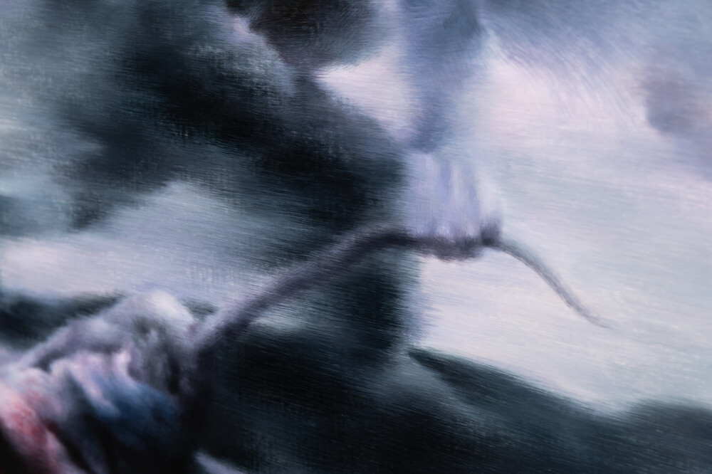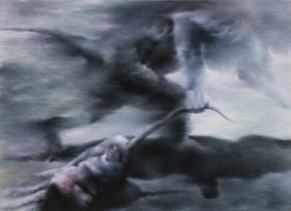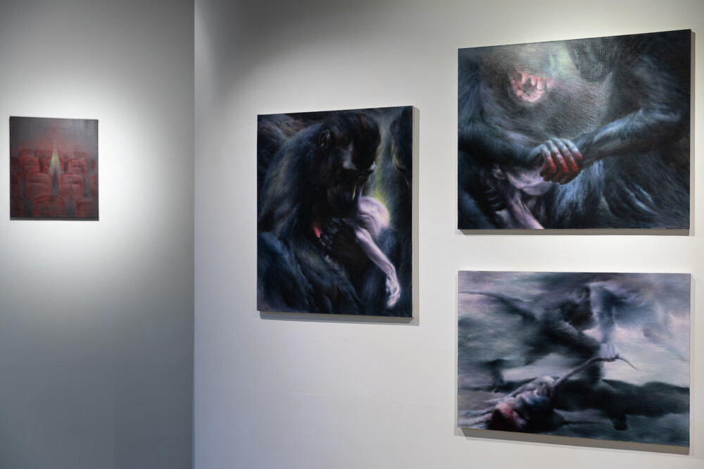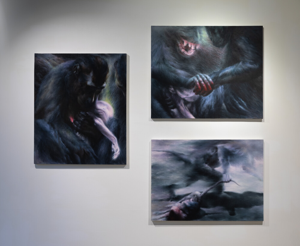 오새미 작가의 <단계> 시리즈는 어미 원숭이가 새끼의 죽음 앞에서 보이는 일련의 행동 방식을 기록한 다큐멘터리에서 영감을 받은 작품입니다. 복잡다단한 사고 체계를 지닌 인류의 눈부신 이성조차 단번에 허물어뜨리고 마는 가장 강력한 본능인 '모성애'가 주제로 나타나고 있습니다. 새끼 원숭이의 죽음 가운데에 보여지는 어미 원숭이의 행동들을 가까이서 포착하듯 캔버스에 담아내어 전장과 같은 생사 속의 깊은 슬픔과 여운을 표현한 작품입니다.