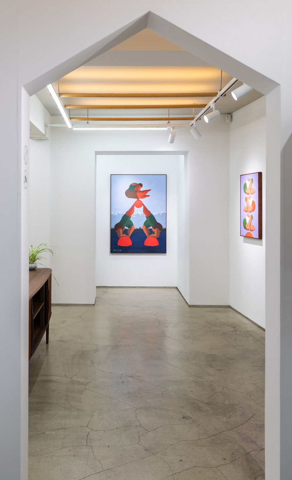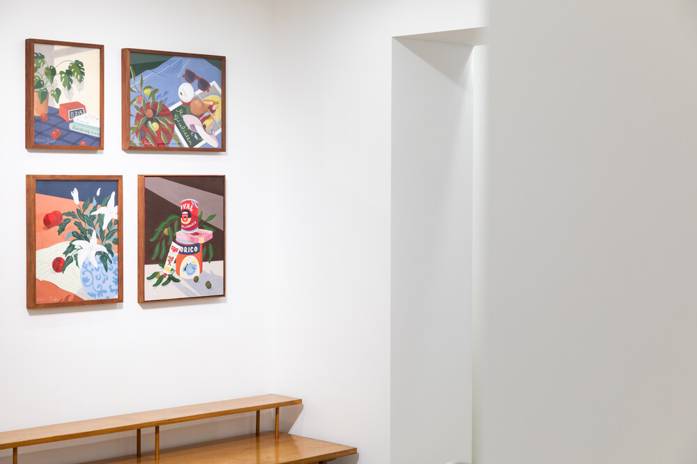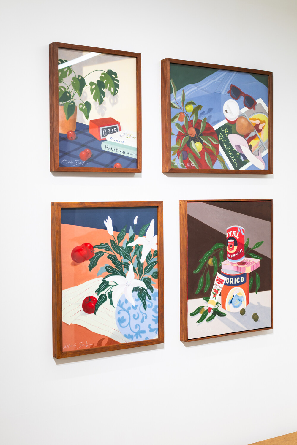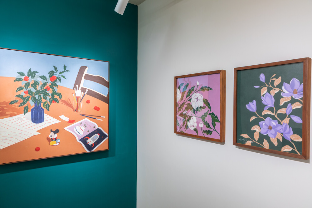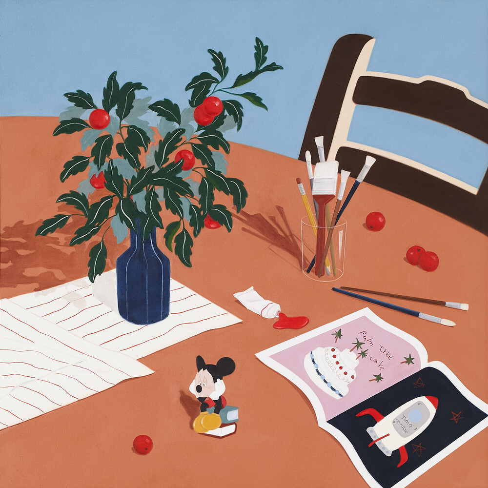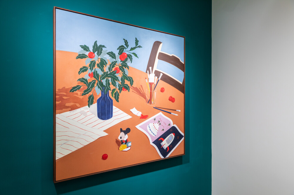 The artist painted this while recalling moments shared with a child. The objects on the table are not merely things, but carriers of family tastes and memories. The Mickey Mouse doll was a childhood favorite of the artist, while the tomatoes are what the child particularly dislikes. The doll’s expression seems almost to echo that feeling.