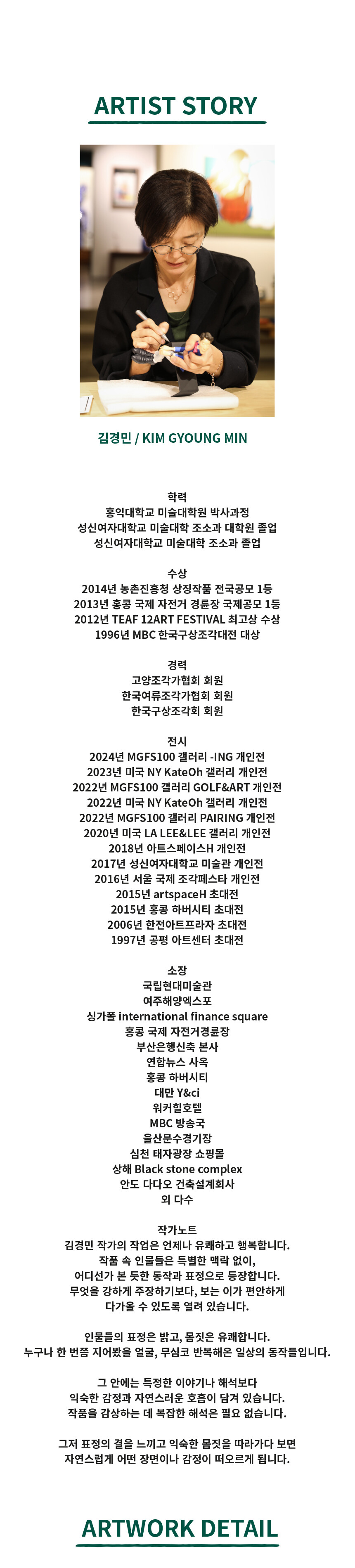 김경민 작가는 조각과 회화라는 두 가지 매체를 넘나들며, 일상의 순간들을 포착하고, 그 안에서 발견되는 행복함과 유쾌함, 그리고 대중과 편하게 공감대를 형성하는 의미를 탐색합니다.