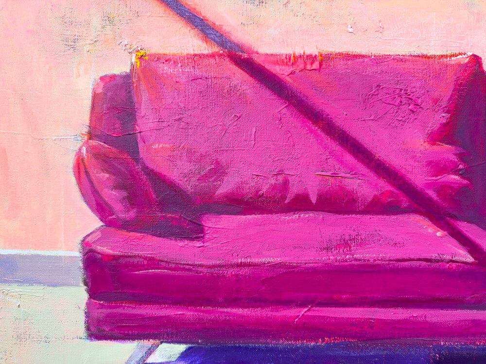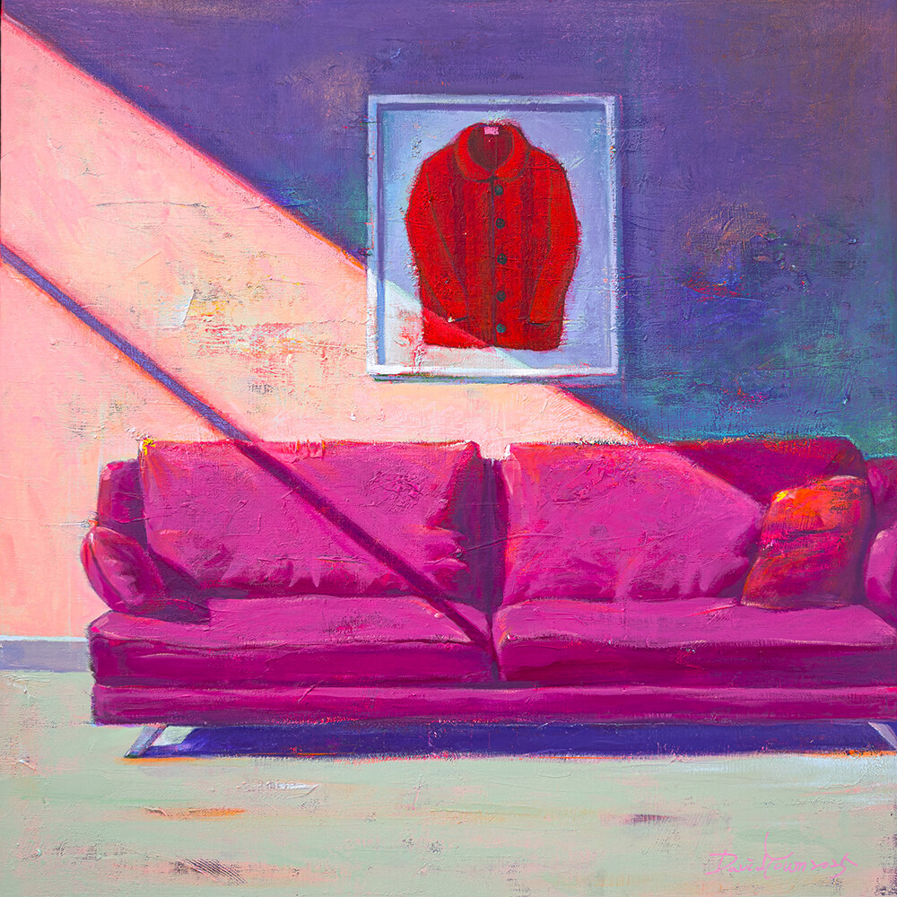 따사로운 햇빛이 사선으로 들어오는 거실 풍경이 그려져 있습니다. 화면 한가운데 분홍빛 소파가 놓여 있고, 그 위 벽에는 붉은 스웨터 한 벌이 액자처럼 걸려 있습니다. 색감은 강렬하지만, 분위기는 조용하고 따뜻하게 가라앉아 있습니다.