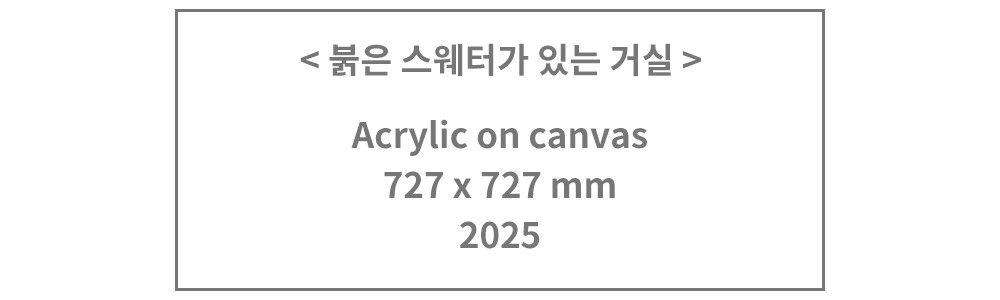 <붉은 스웨터가 있는 거실>은 일상의 공간 속에 머무는 기억과 감정을 섬세하게 담아낸 작품입니다. 조용한 풍경 속에서 누구나 한번쯤 마음속에 품고 있는 따뜻한 장면을 떠올리게 만듭니다.