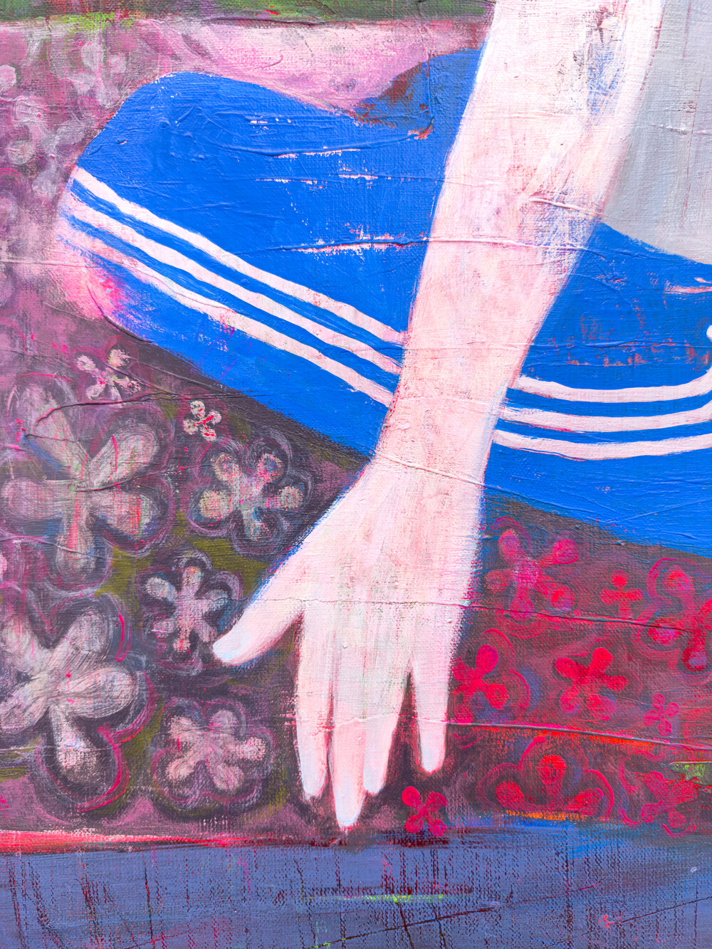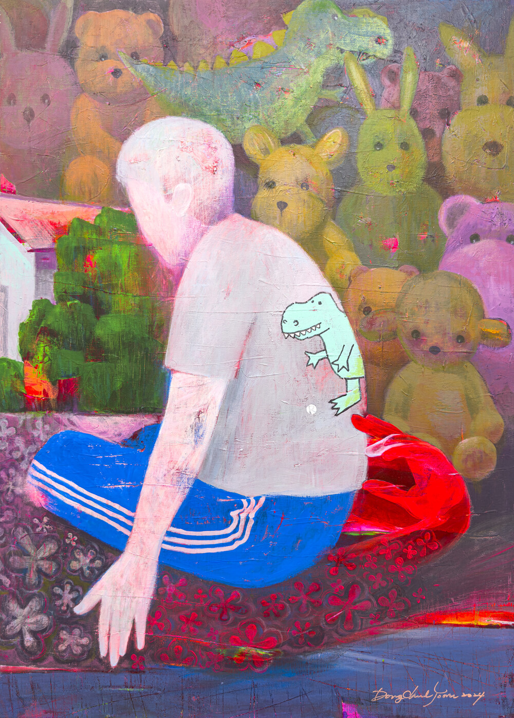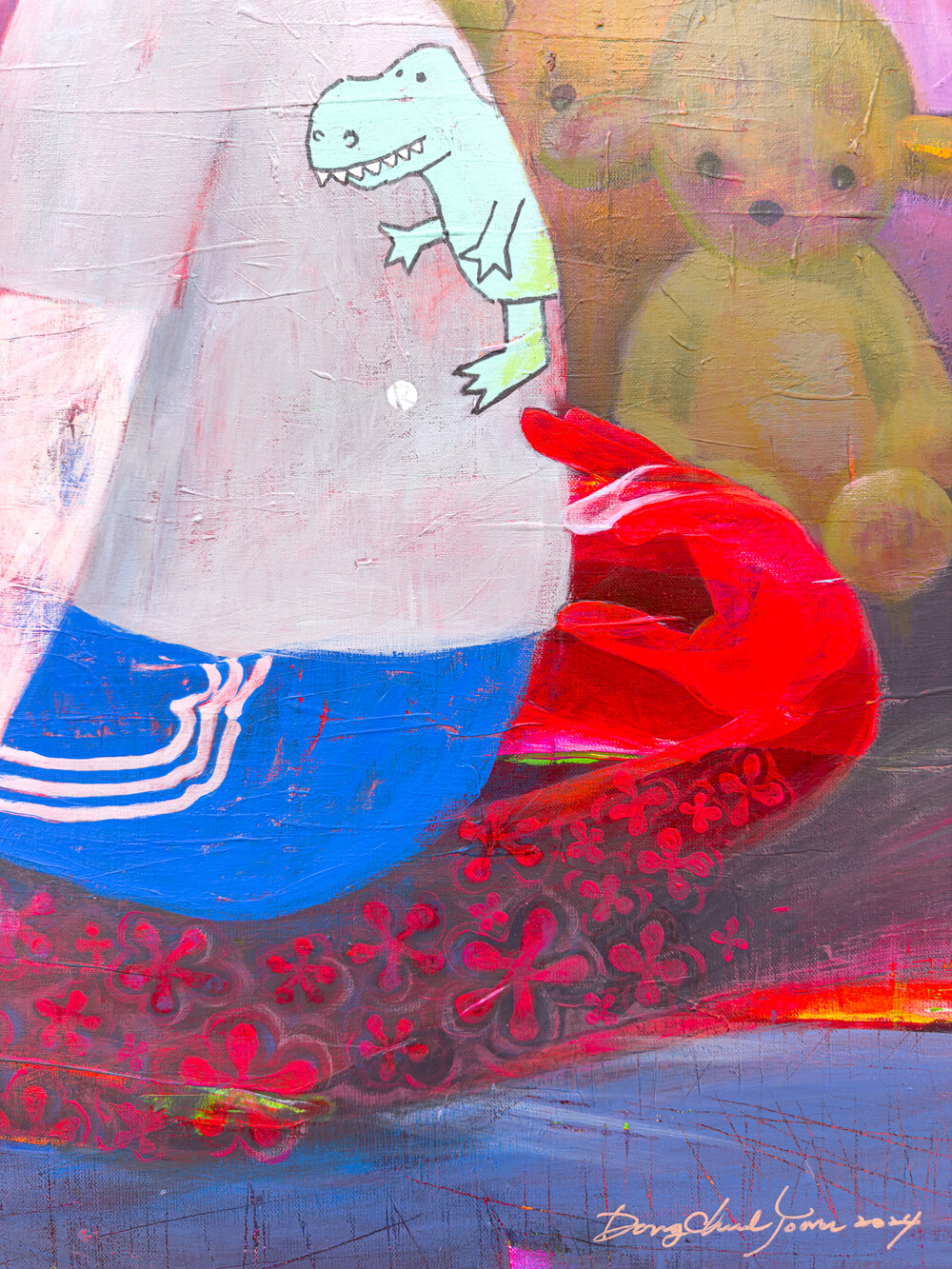 티셔츠에 그려진 공룡 그림, 푸른 운동복 바지, 꽃무늬 러그 같은 요소들은 일상의 일부처럼 친근하게 다가오면서도, 동시에 어딘가 몽환적인 인상을 남깁니다. 화면 왼편에는 나무와 함께 집의 형태가 희미하게 나타나며, 누군가 머물렀던 공간의 흔적이 느껴집니다. 집이나 거실처럼 사람들이 함께 머무는 장소는 관계와 온기를 상기시키는 배경으로 작용합니다.