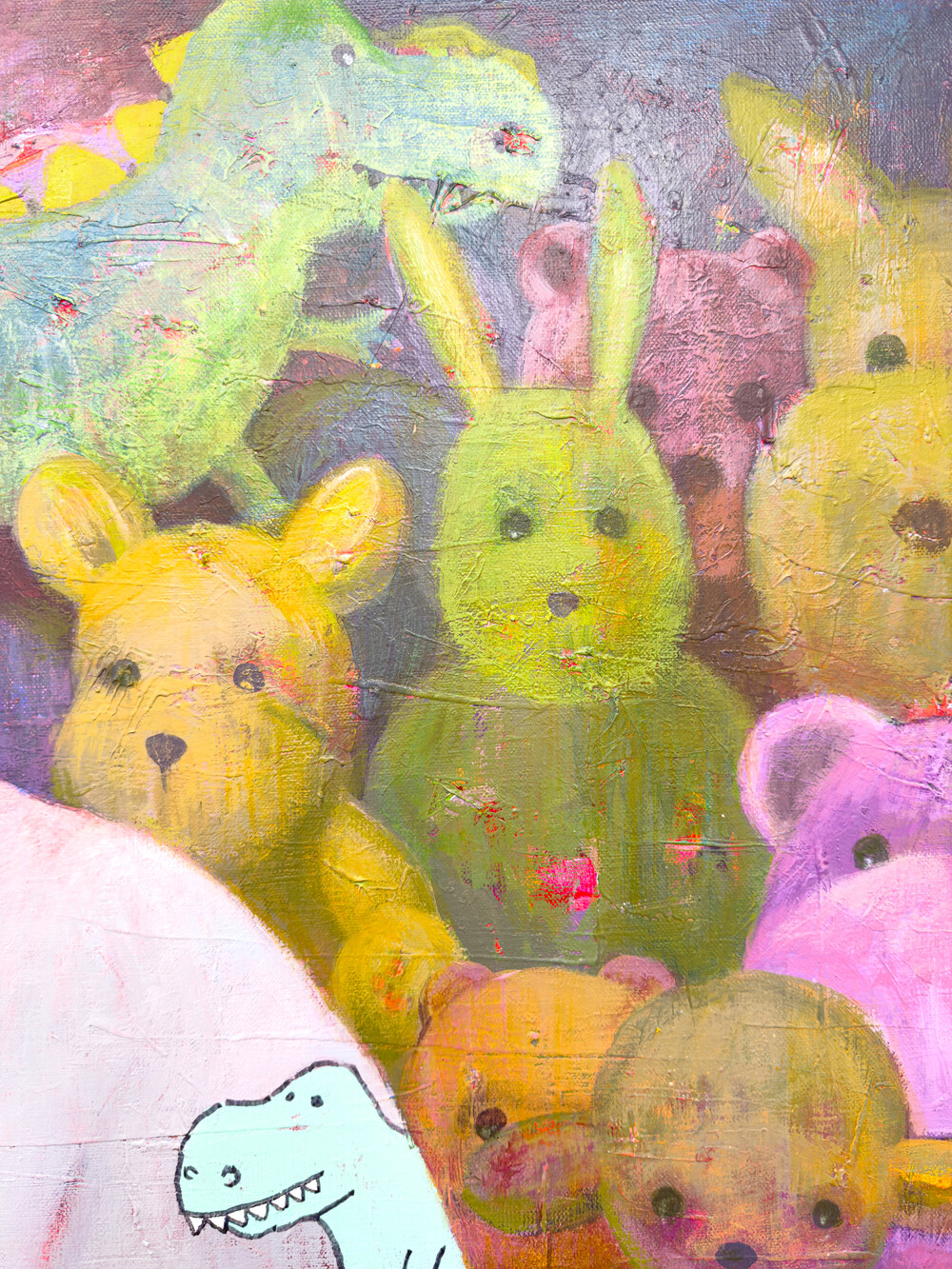 화면 중앙에는 등을 보인 인물이 바닥에 앉아 있습니다. 그 주변을 빼곡히 채운 인형들이 눈에 들어오고, 인물 뒤로는 선명한 붉은 손이 조심스럽게 닿고 있습니다. 곰 인형을 비롯한 인형들은 사람을 상징하듯 배치되어 있으며, 조용히 자리를 지키는 모습이 마치 말 없이 곁을 지키는 누군가를 떠올리게 합니다.