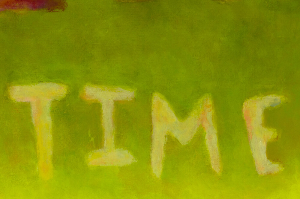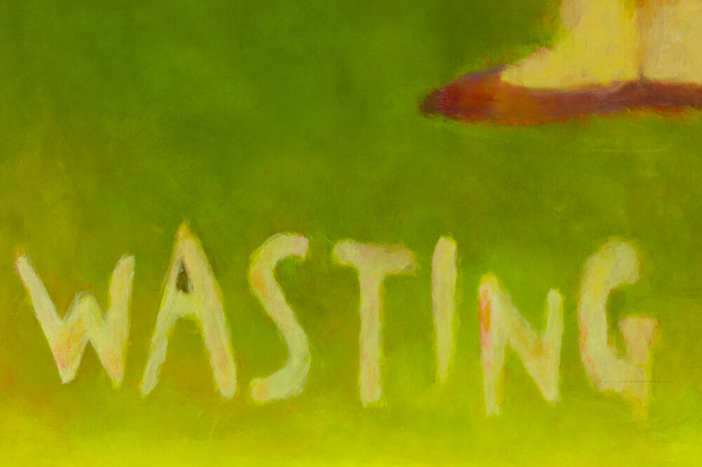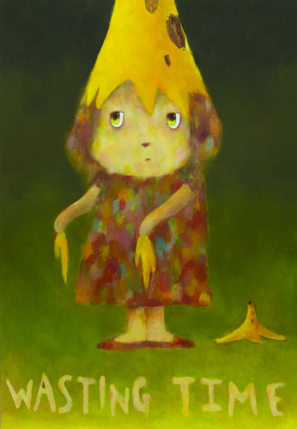 At the bottom of the painting, the words “WASTING TIME” appear like a bold declaration. And yet, the phrase feels gentle.Looking at the dog standing just above it, you might find yourself believing that it’s because of that wasted time that it now stands there at all.