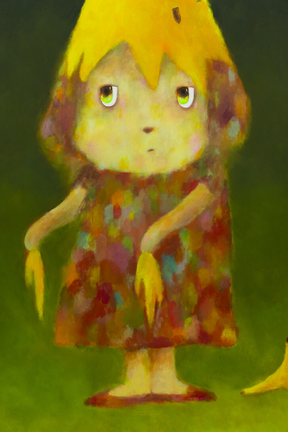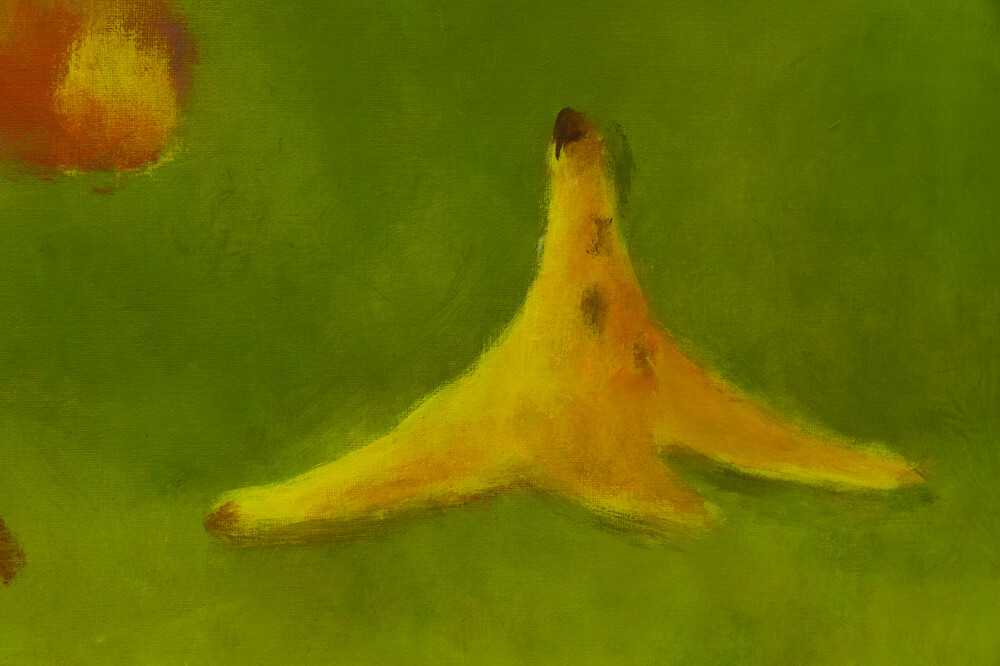 A dog appears frozen in place, without purpose or direction. It holds a banana peel in its hand, wears another on its head, while one more rests at its feet. Its gaze floats toward empty space, and its face is blank—emotionless. It feels like being lost at the very center of time.