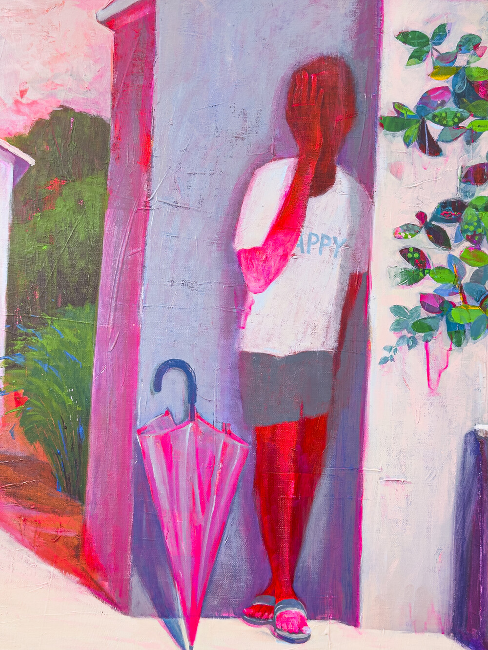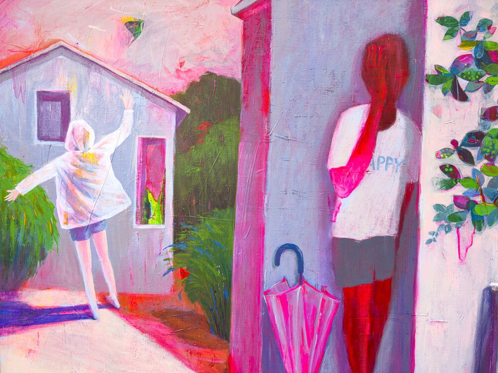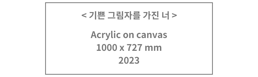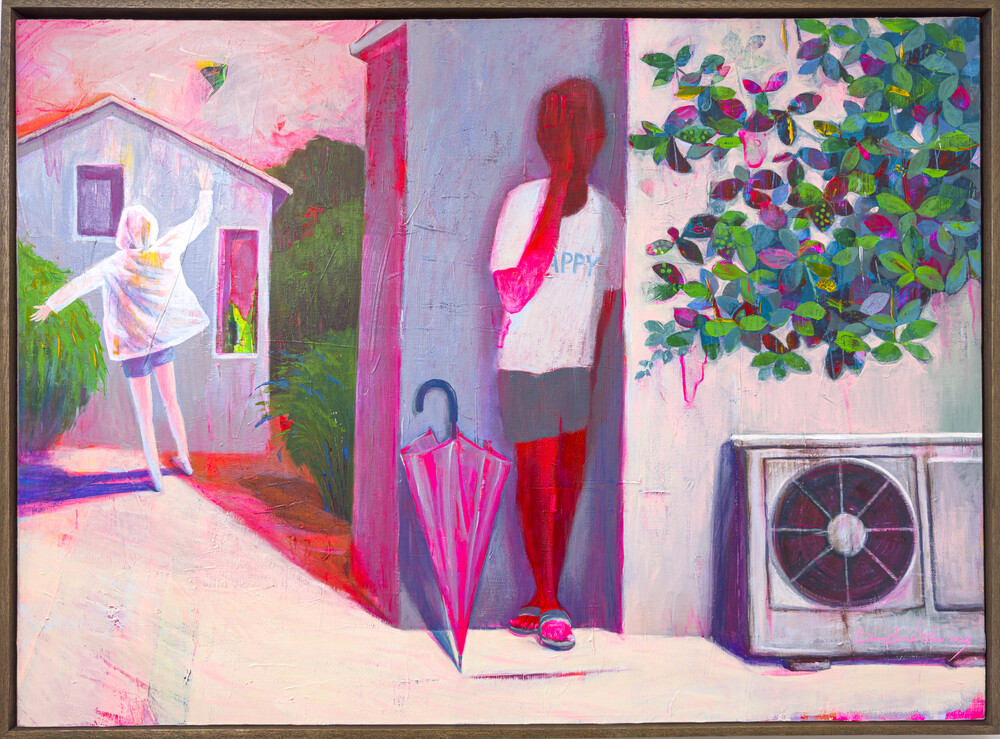 이 장면은 여름날 소나기가 그친 뒤, 햇살이 들기 시작하는 짧은 순간을 담고 있습니다. 비와 해가 맞닿는 경계를 바라보며 느꼈던 기분 좋은 순간이 고스란히 화폭 위에 펼쳐집니다. 우비를 입은 인물의 발밑에는 선명한 그림자가 드리워져 있고, 벽에 기댄 인물의 티셔츠에는 'HAPPY'라는 문구가 적혀 있습니다. 그 문구는 마음속 어딘가에 자리한 조용한 바람처럼 느껴집니다.